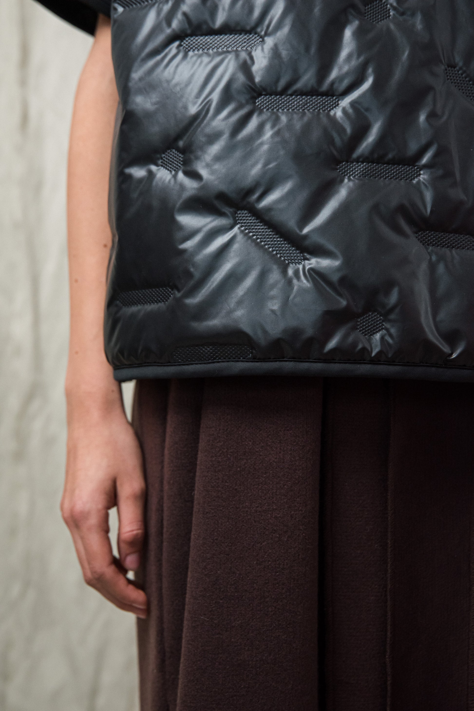 Ez az alapanyag kívül és belül egyaránt ugyanabból a visszafogottan fényes felületű textilből készül, amely kellemes tapintású és megbízható formatartást biztosít. A két textilréteg között könnyű, finoman strukturált vatelin gondoskodik a hőszigetelésről anélkül, hogy felesleges súlyt vagy túlzott volument adna. A rétegelt szerkezet jól megtartja a formát és támogatja a kabát letisztult vonalvezetését. Az anyagválasztás a tartósságra, a komfortos viselhetőségre és a hosszú távú, tudatos használhatóságra fókuszál.