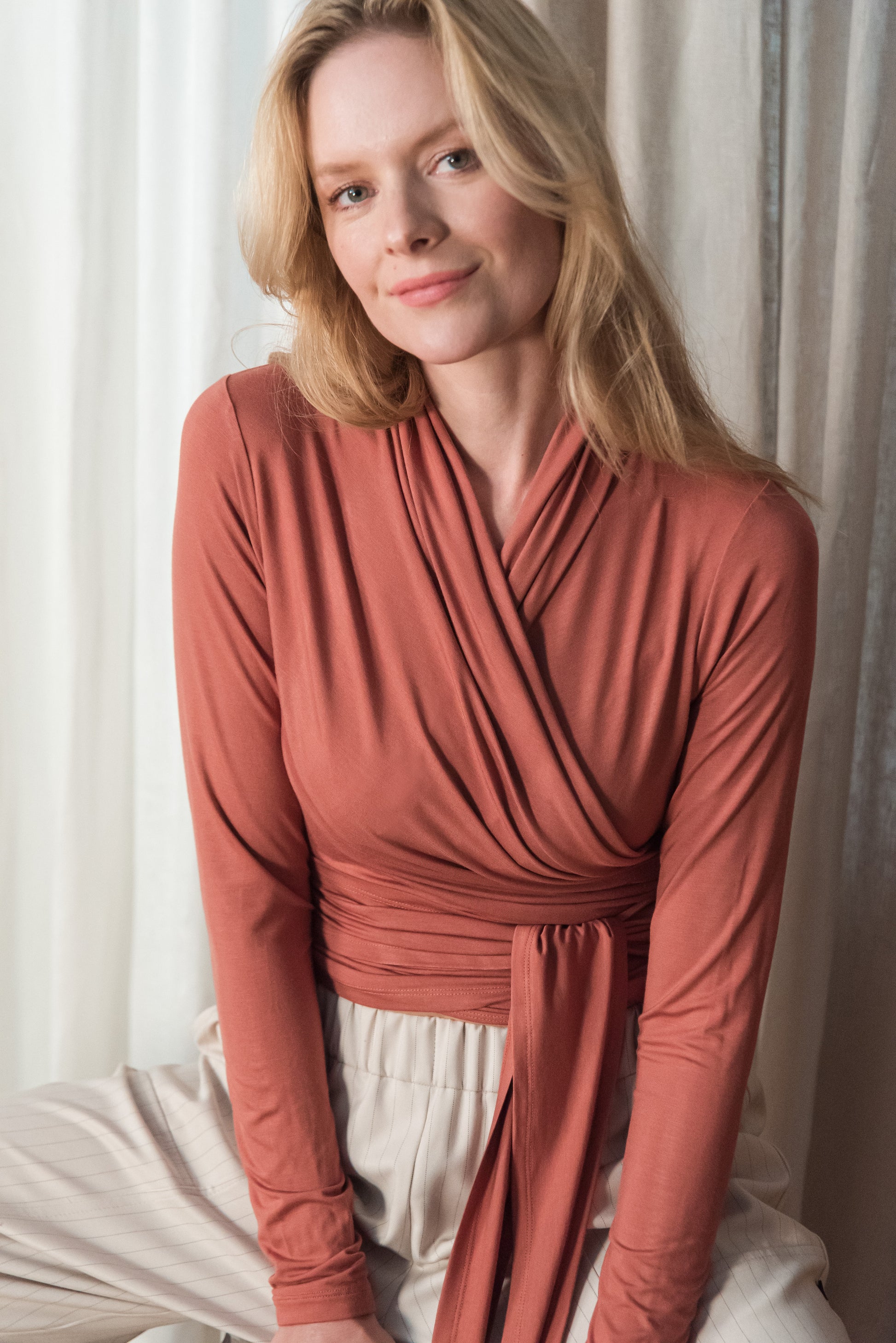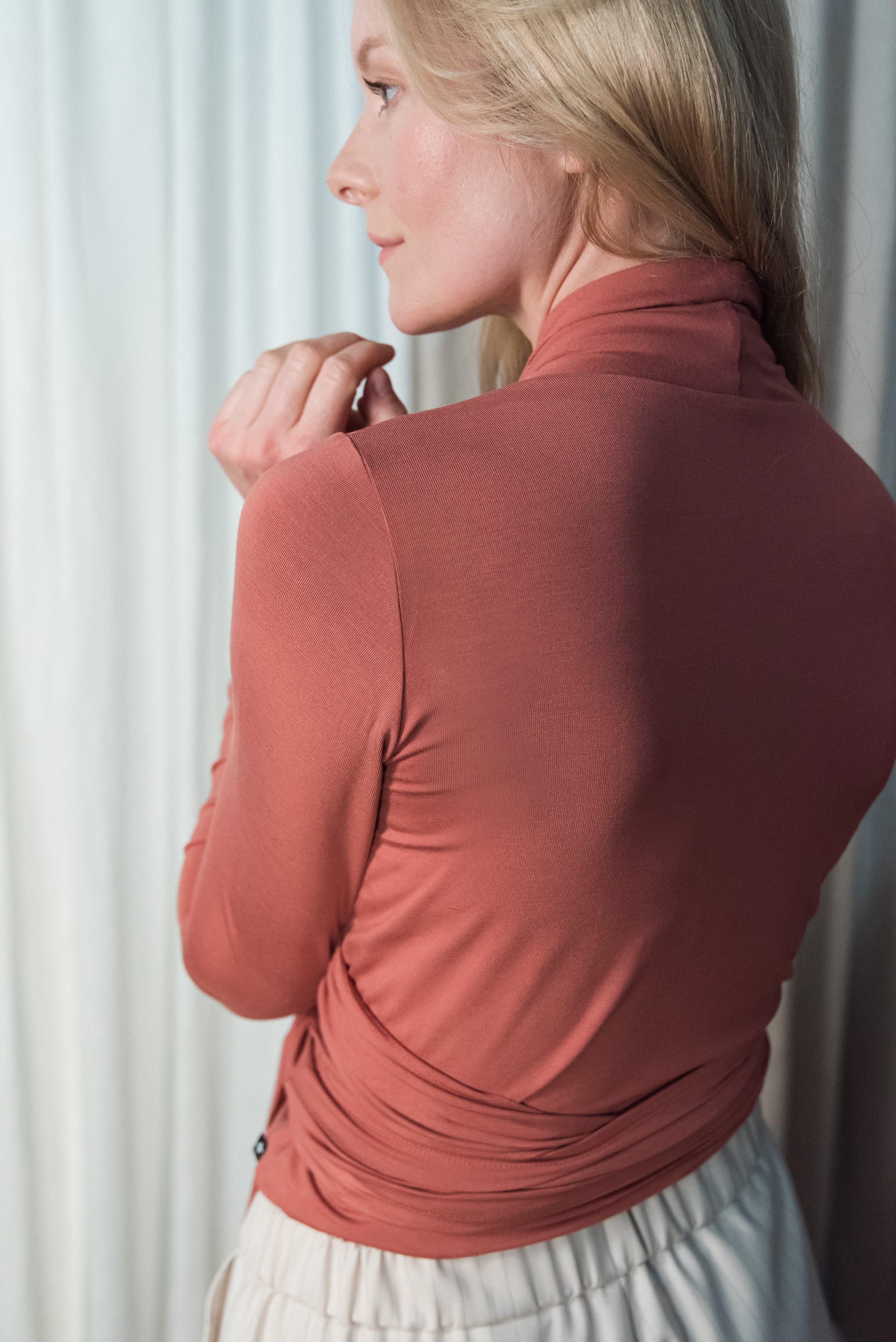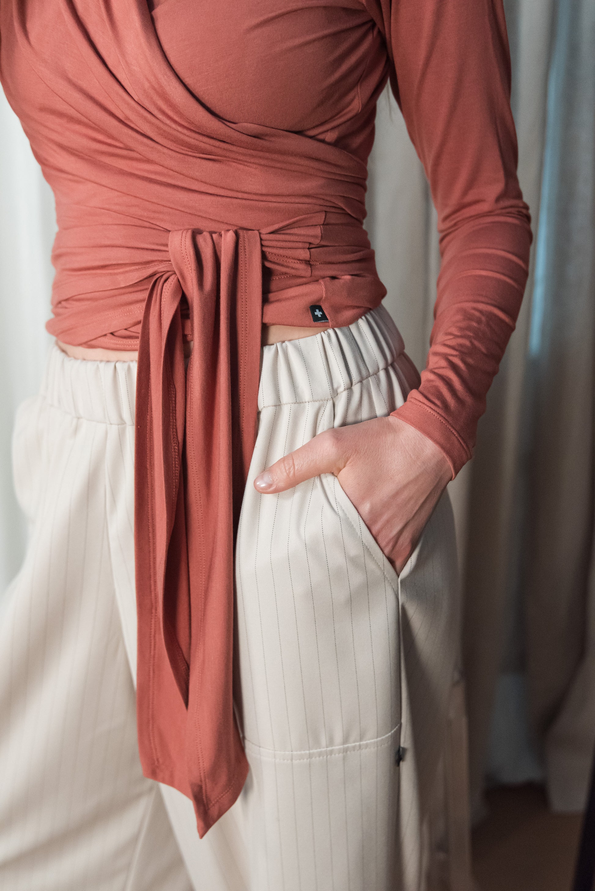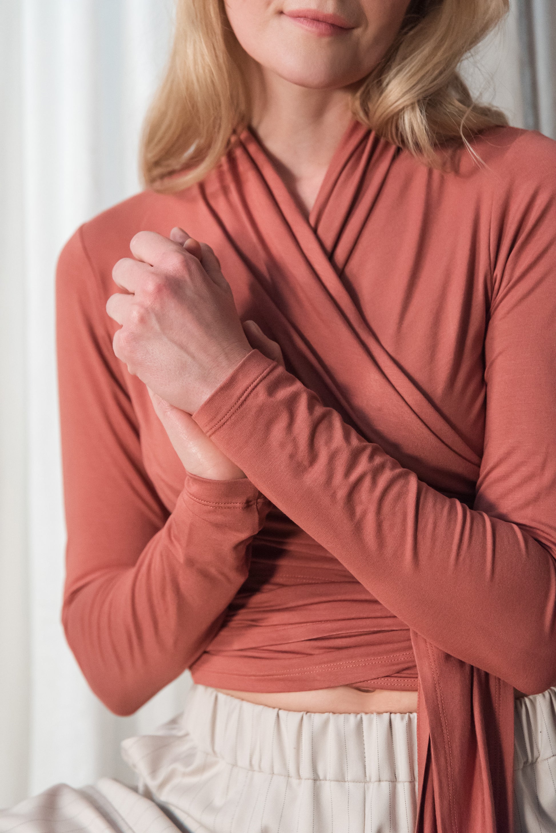 > A NOMI felső puha bambusz anyagból készült, nőies szabású, hosszú ujjú darab, amely finoman követi a test vonalát. Az átlapolós fazont elöl vagy hátul is megkötheted – hangulatodhoz, alkalomhoz igazítva. Viselheted nadrággal, szoknyával, vagy egy ruhára felvéve plusz rétegként. Sokoldalú és kényelmes darab, amely teret ad az önazonos öltözködésnek.