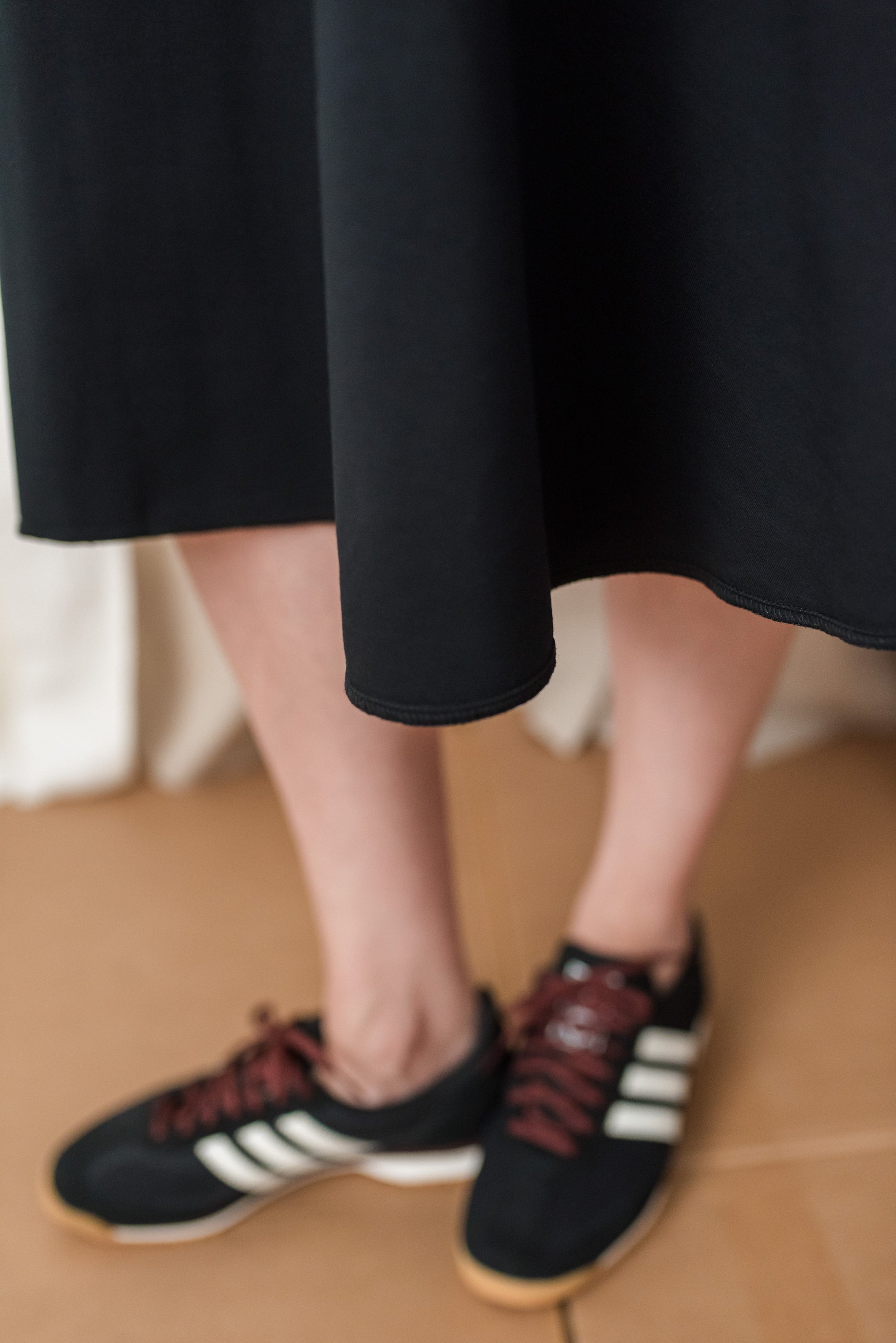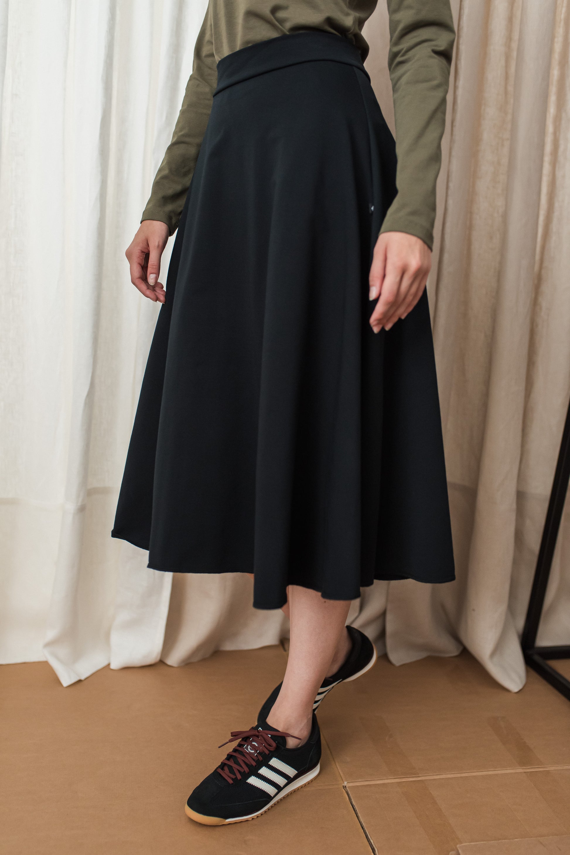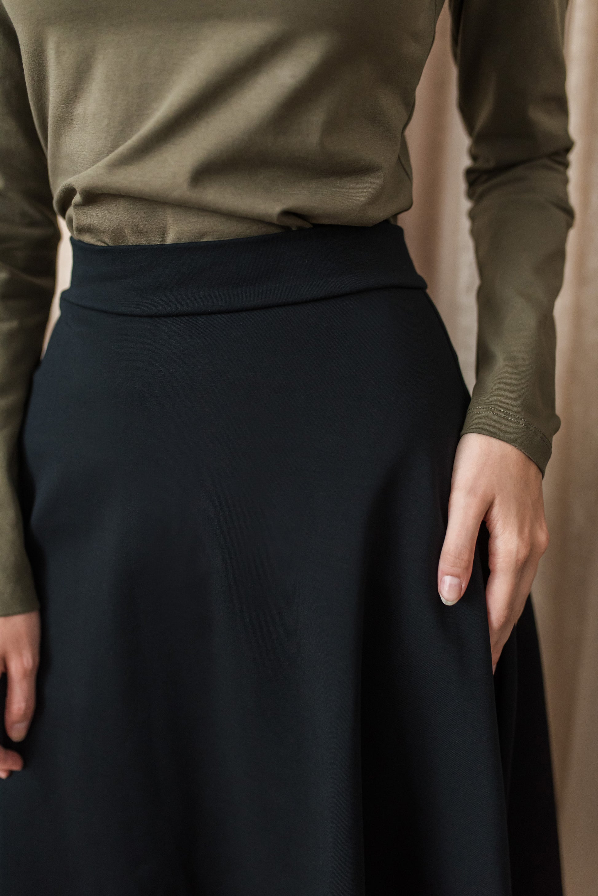 > A NUI szoknya sportosan nőies megjelenést kölcsönöz letisztult szabásával. Fekete pamut futter anyagunkból kellemes viselet, amely derék részen követi a test vonalát, majd lefelé finoman bővül. A térdig érő fazon elegáns, mégis praktikus viselet - sokféle stílusú felsőrésszel kombinálható. Remek választás hétköznapi vagy elegánsabb összeállításokhoz is.