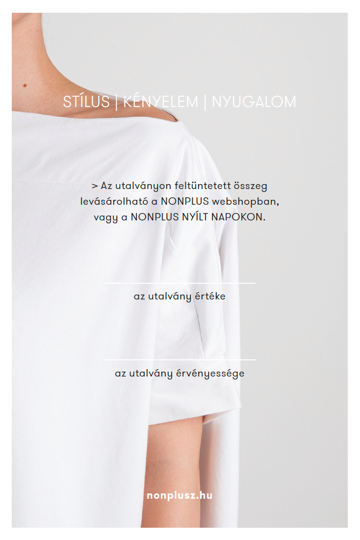 A NONPLUS ajándékutalvány olyan ajándék, ami valóban teret ad a választás örömének. A megajándékozott akkor és azt a ruhát választhatja, amelyben igazán jól érzi magát. Hazai tervezésű, kézzel készült darabok - a NONPLUS márkára jellemző nyugodt, letisztult szemléletben. Ez az utalvány nem siettet, nem irányít - egyszerűen csak lehetőséget ad egy olyan döntésre, ami tényleg róla szól.