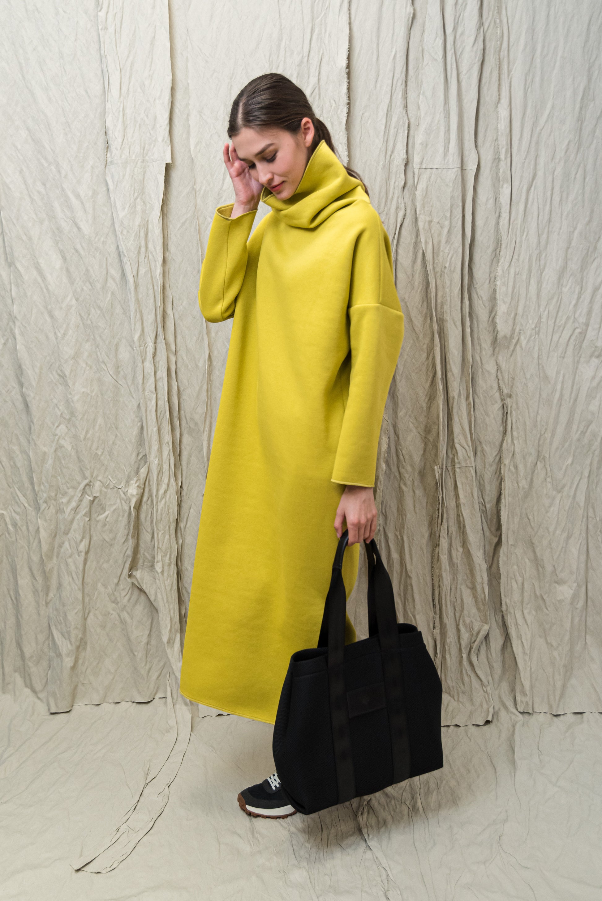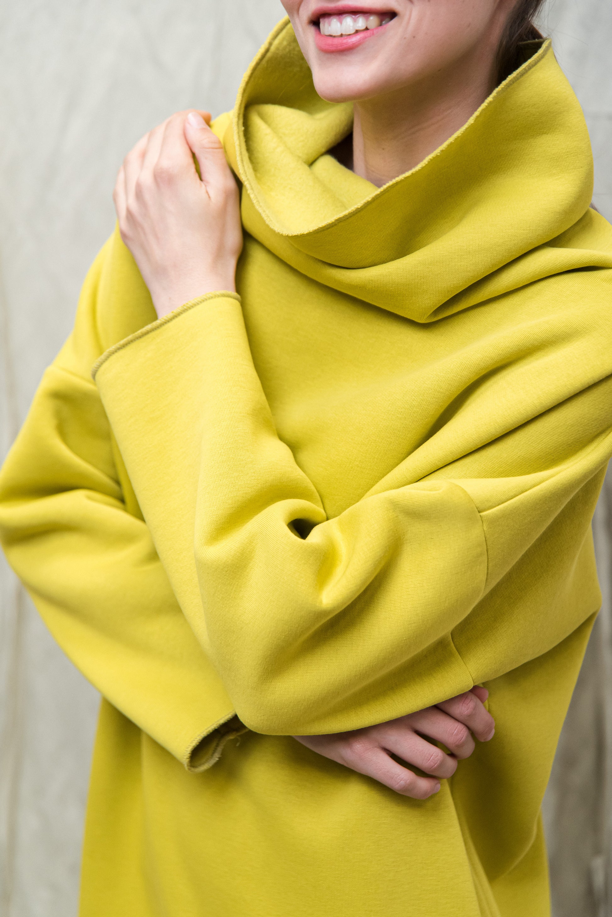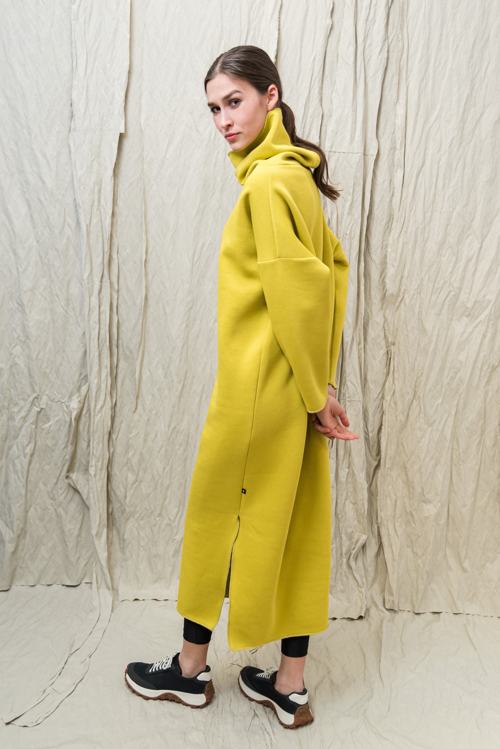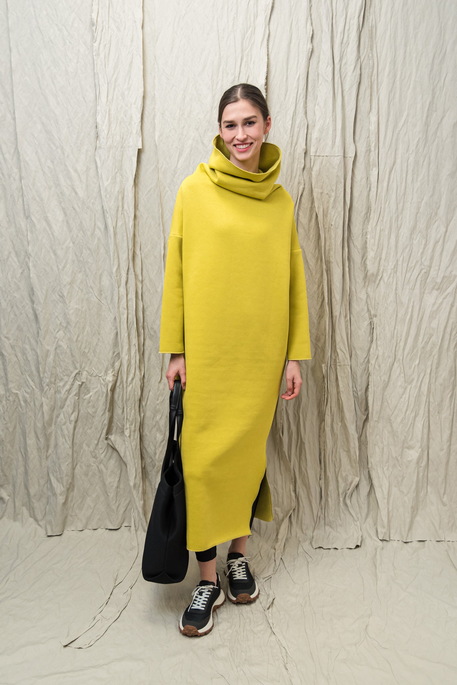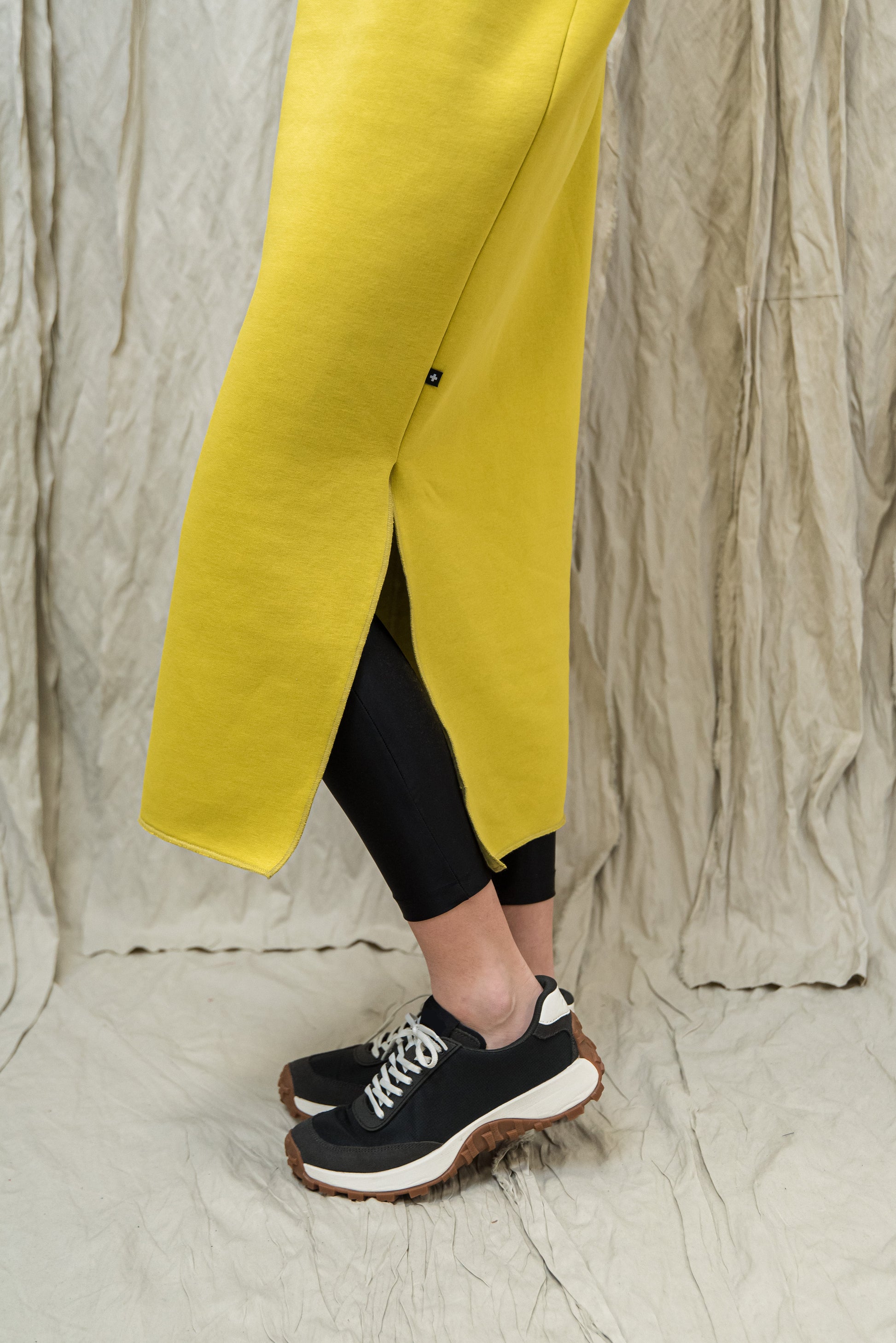 > A RUTO pulóverruha a hosszú vonalvezetés és a komfortos szabadság nyugodt egyensúlyát képviseli. Kámzsás kialakítása védelmezően öleli körbe a nyakat, miközben a ruha letisztult, függőleges arányai karcsú, határozott sziluettet rajzolnak. A hossz a testmagasságtól függően vádliig vagy bokáig ér, így egyszerre határozott és könnyed megjelenést ad. Az oldalsó slicc finoman oldja a zárt formát, biztosítva a szabad mozgást és a kényelmes lépteket. Az anyag széleinek látható lock eldolgozása tudatosan hagyja érvényesülni az anyag természetes karakterét, letisztult, puritán részletként illeszkedve az összképbe. A RUTO olyan darab, amelyben a sportos funkcionalitás és a visszafogott elegancia természetesen simul egymásba – ideális választás a hűvösebb napokra, amikor a kényelem és a karakter egyaránt fontos.