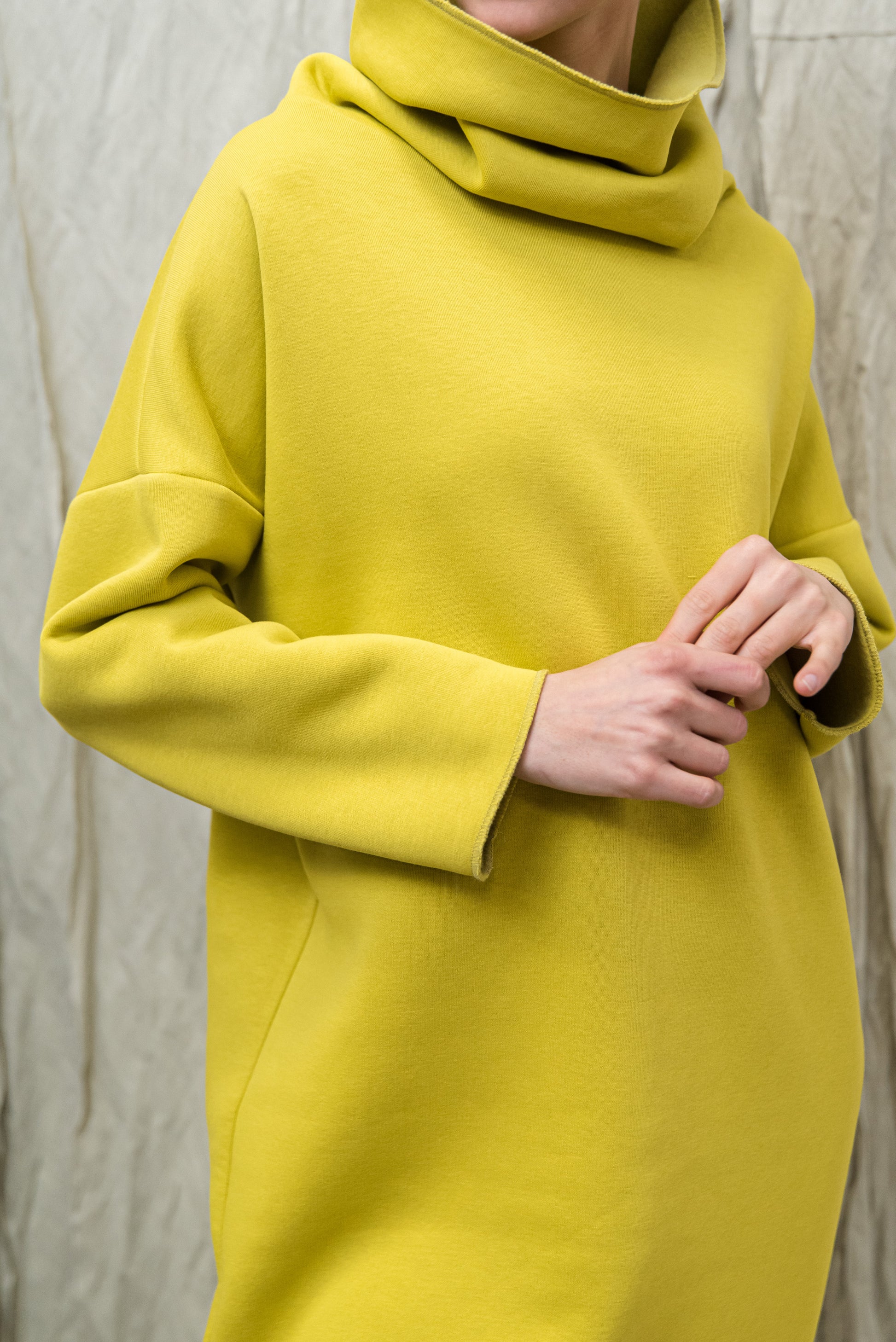 A RUTO pulóverruha BIO pamut alapanyagból készült, amely kívül sima, letisztult felületű, belül pedig finoman prémes tapintású. Ez a kettősség egyszerre ad rendezett megjelenést és meleg, ölelő komfortérzetet. Az anyag minimális rugalmassággal rendelkezik, így megtartja a ruha formáját, miközben kényelmes viseletet biztosít egész nap. A természetes pamut légáteresztő tulajdonságainak köszönhetően kellemes érzetet ad, rétegezve és önmagában viselve is ideális választás.