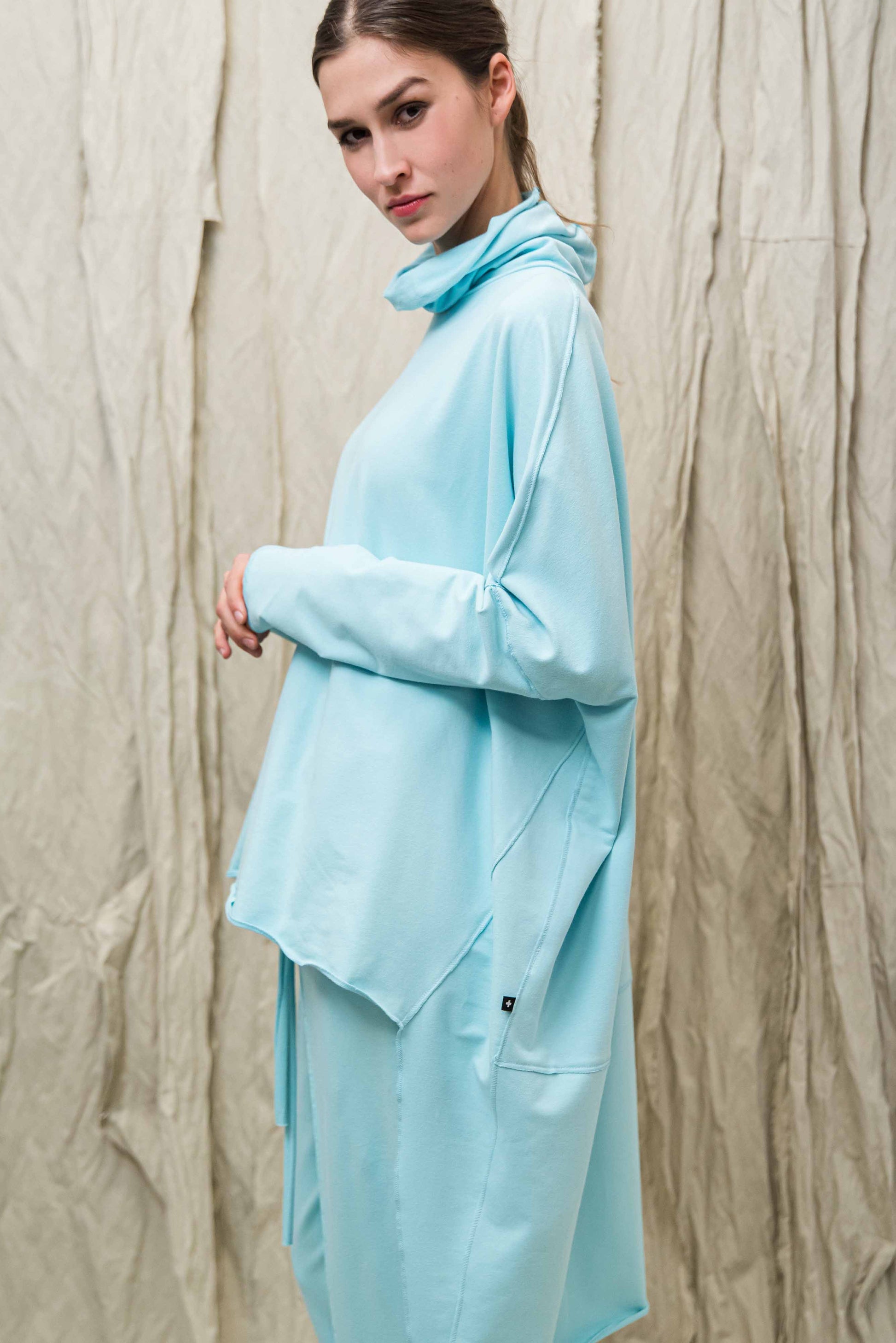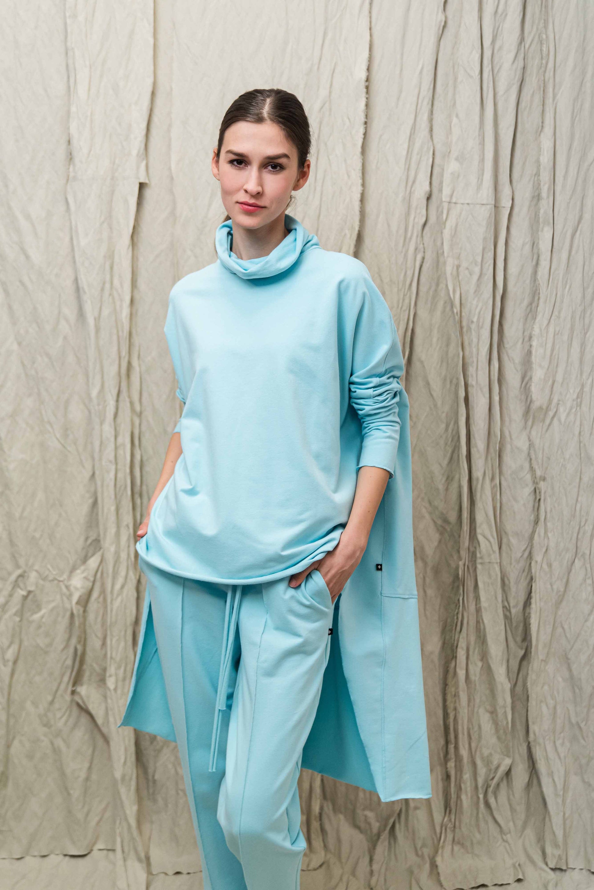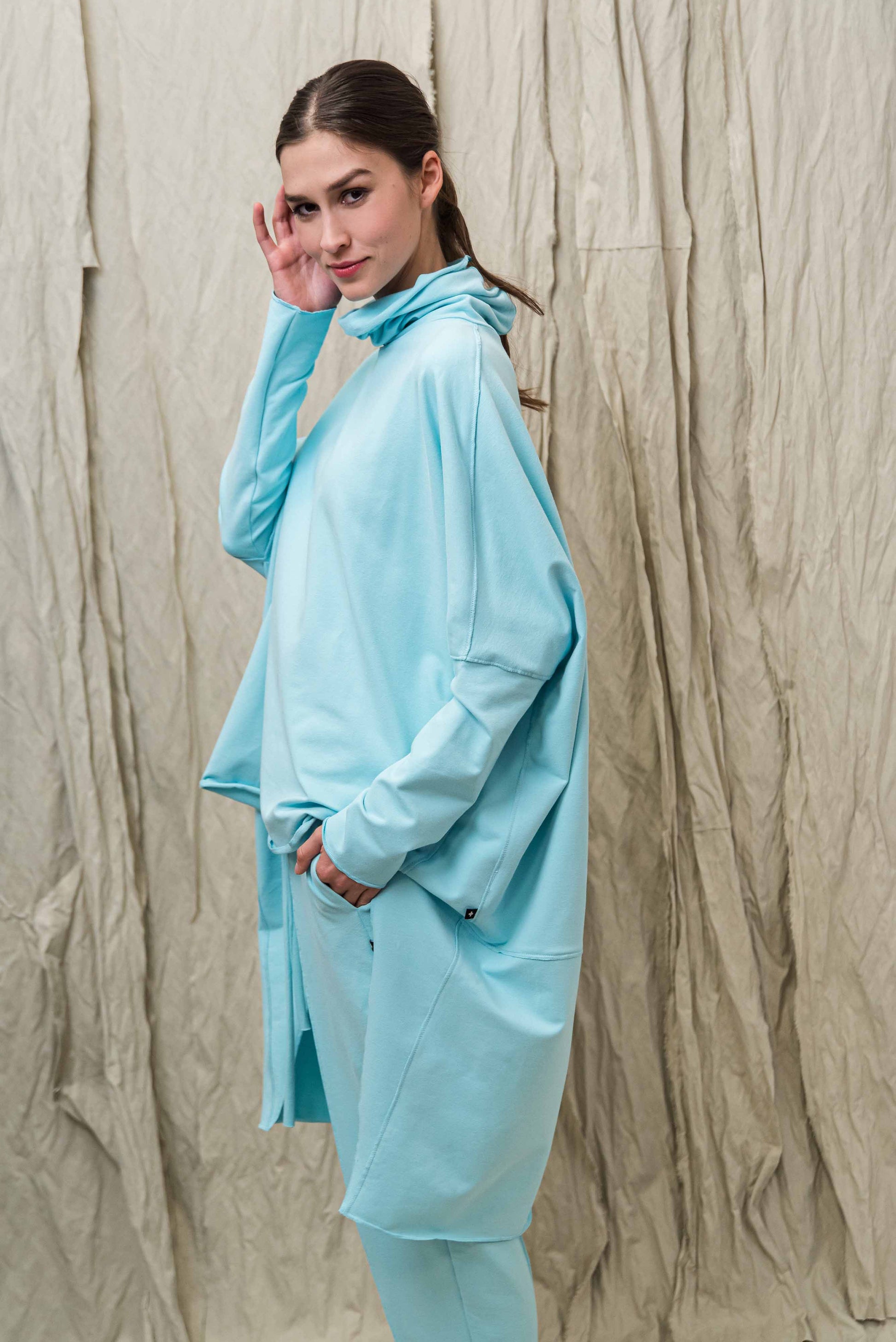 > A SATO pulóver a tudatos kényelem és a karakteres minimalizmus találkozása: egy darab, amelyben egyszerre lehetsz szabad és határozott. Oversize szabásvonala, elöl rövidebb, hátul hosszabb kialakítása modern, rétegezhető sziluettet ad, miközben természetes mozgásteret biztosít a mindennapokban. A lágy esésű, bőrbarát pamut alapanyag fenntartható választás, amely hosszú távon is megőrzi formáját és minőségét. A lockolt, nyers hatású anyagszélek puritán őszinteséget kölcsönöznek a fazonnak – ez a tudatosan vállalt egyszerűség adja nagyvonalú, könnyed karakterét. Garbós nyakmegoldása véd és ölel, mégsem nehezít, így átmeneti időszakban és hűvösebb napokon is ideális társ. Leggingsszel vagy szűkebb nadrággal harmonikus arányokat teremt, megoldást kínálva a „kényelmes, de mégis rendezett” öltözködés dilemmájára. Ha olyan időtálló, letisztult darabot keresel, amely nem követ trendeket, hanem saját stílust képvisel, a SATO pulóver a gardróbod stabil alapja lesz.