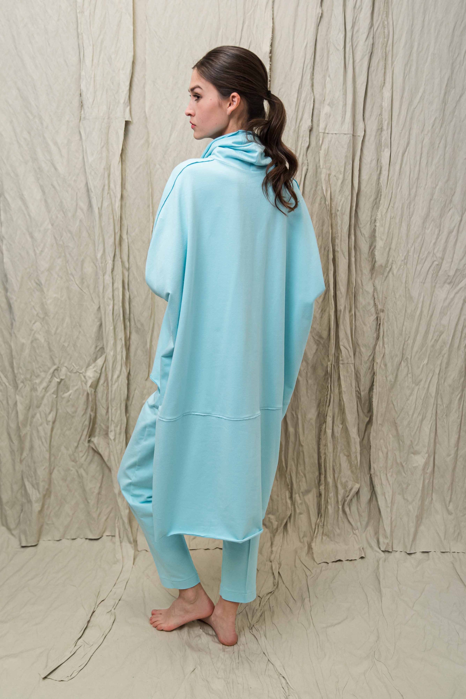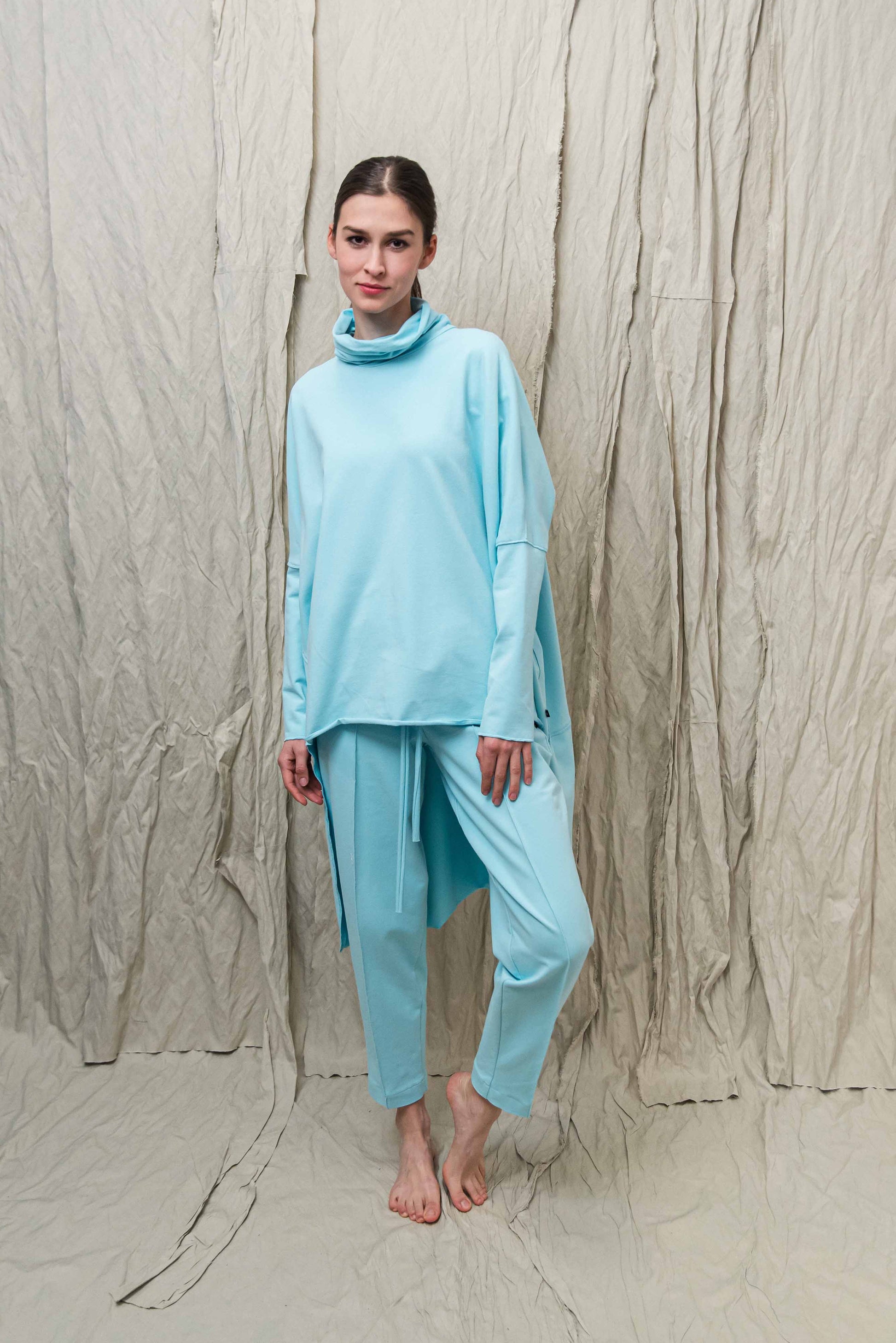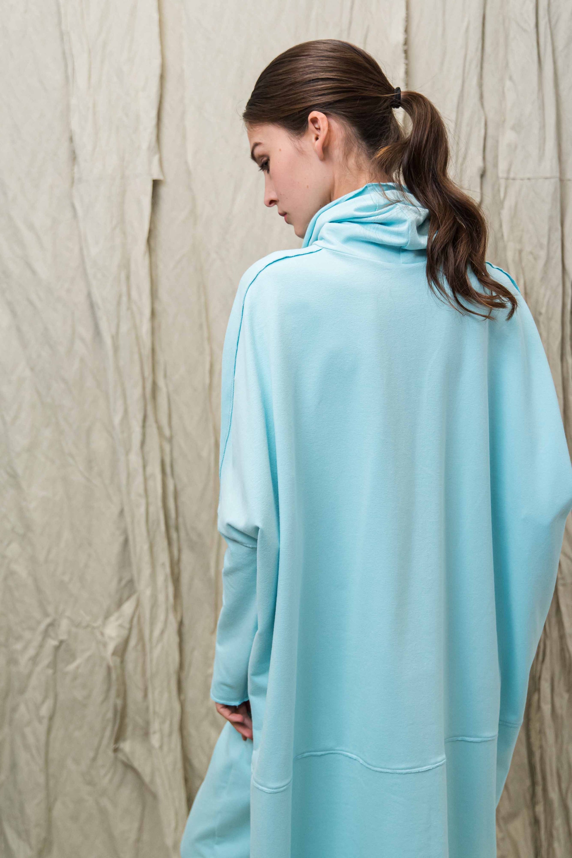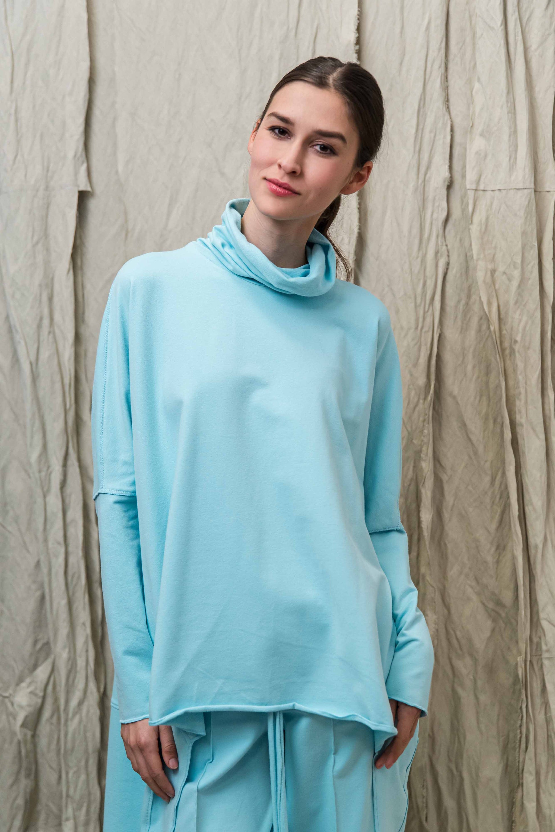 > A SATO pulóver a tudatos kényelem és a karakteres minimalizmus találkozása: egy darab, amelyben egyszerre lehetsz szabad és határozott. Oversize szabásvonala, elöl rövidebb, hátul hosszabb kialakítása modern, rétegezhető sziluettet ad, miközben természetes mozgásteret biztosít a mindennapokban. A lágy esésű, bőrbarát pamut alapanyag fenntartható választás, amely hosszú távon is megőrzi formáját és minőségét. A lockolt, nyers hatású anyagszélek puritán őszinteséget kölcsönöznek a fazonnak – ez a tudatosan vállalt egyszerűség adja nagyvonalú, könnyed karakterét. Garbós nyakmegoldása véd és ölel, mégsem nehezít, így átmeneti időszakban és hűvösebb napokon is ideális társ. Leggingsszel vagy szűkebb nadrággal harmonikus arányokat teremt, megoldást kínálva a „kényelmes, de mégis rendezett” öltözködés dilemmájára. Ha olyan időtálló, letisztult darabot keresel, amely nem követ trendeket, hanem saját stílust képvisel, a SATO pulóver a gardróbod stabil alapja lesz.