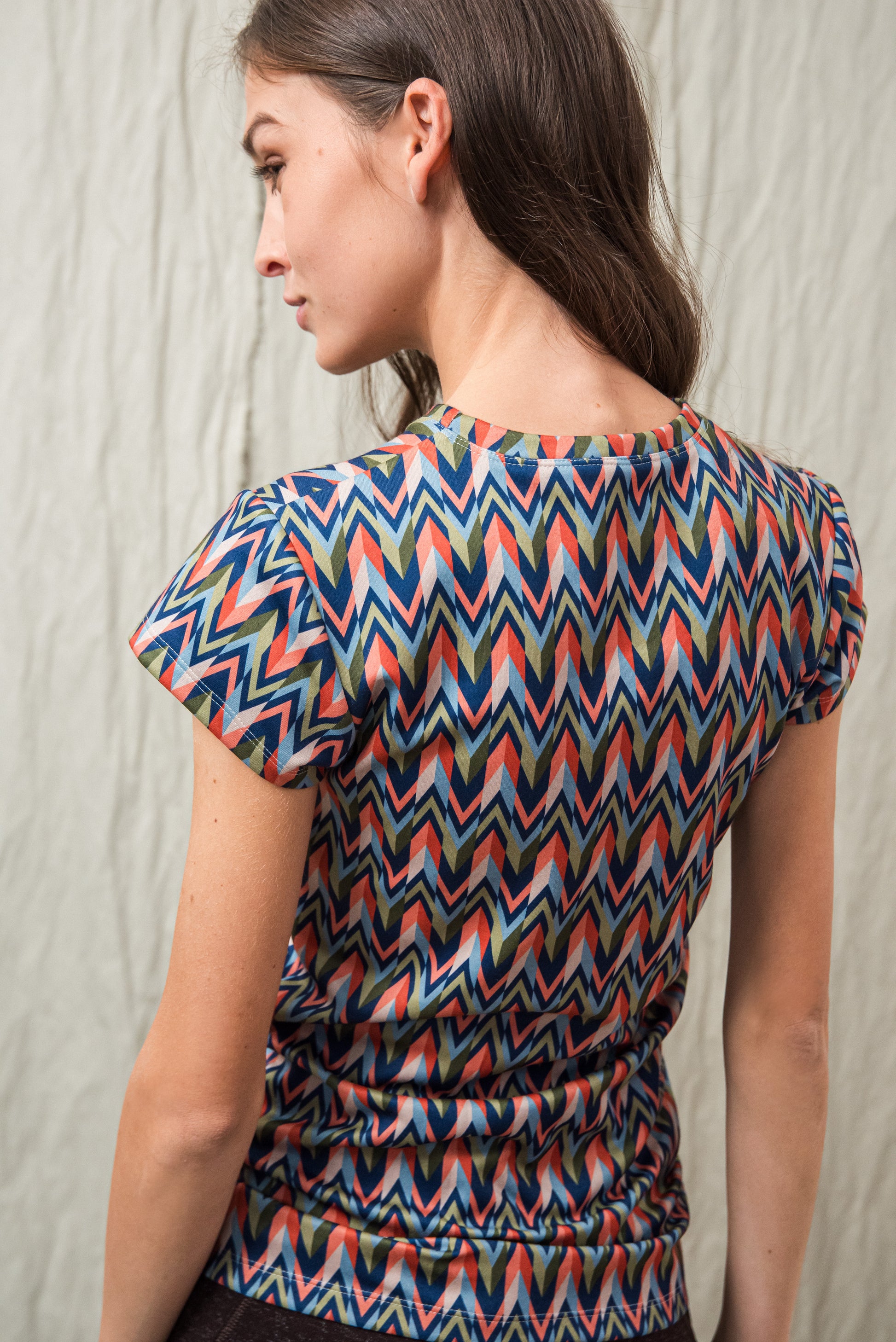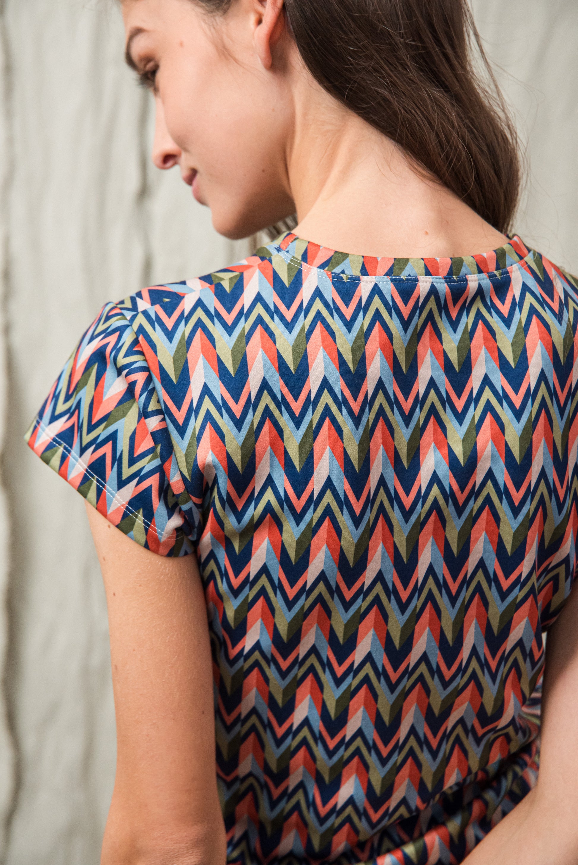 A modell magassága 179 cm, és S méretet visel. A modell méretei: mell - 79 cm, derék - 60 cm, csípő - 88 cm. A méretek között kb. 4 cm különbség van szélességben. Az anyag enyhén rugalmas, érdemes ezt a méretválasztásnál figyelembe venni.