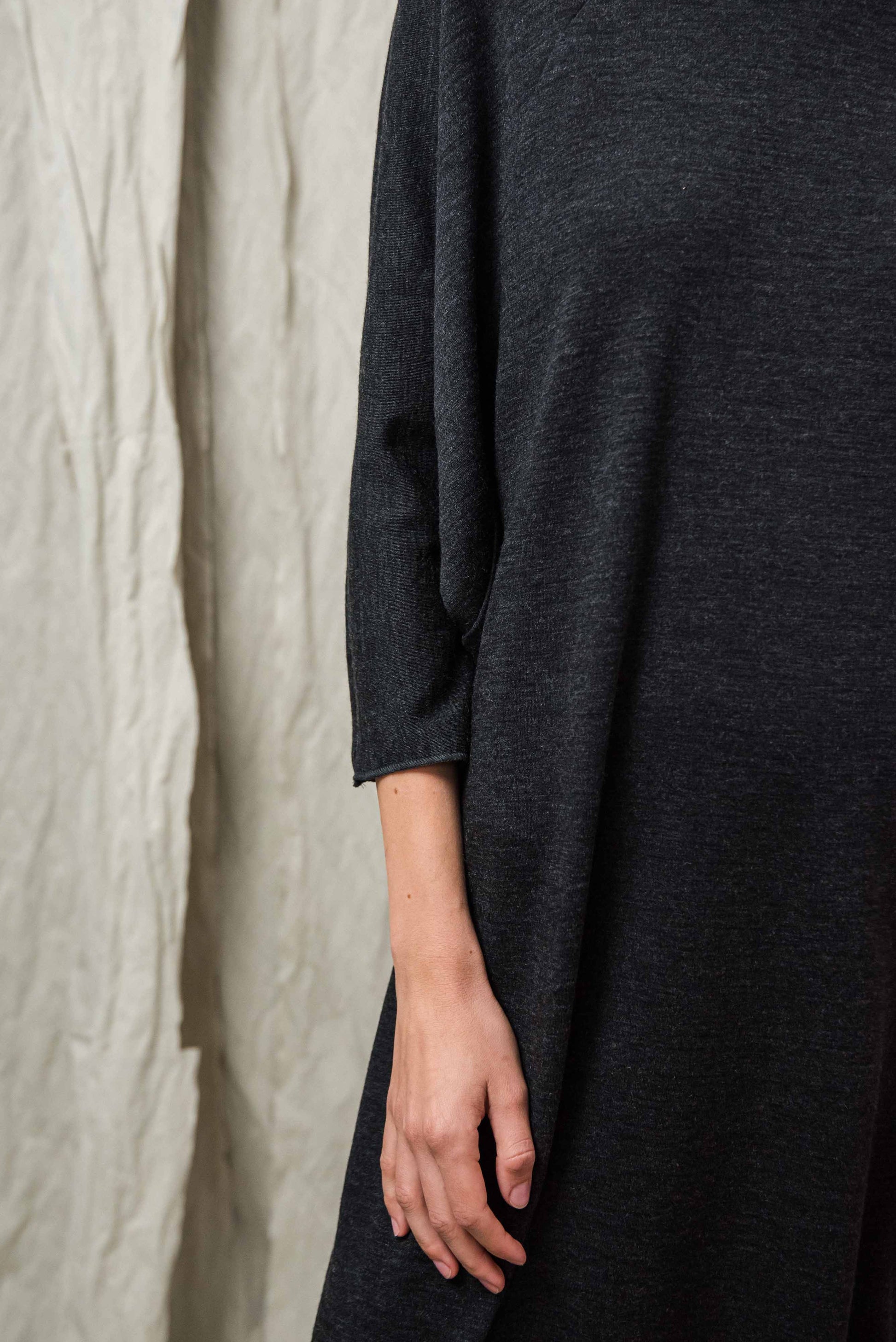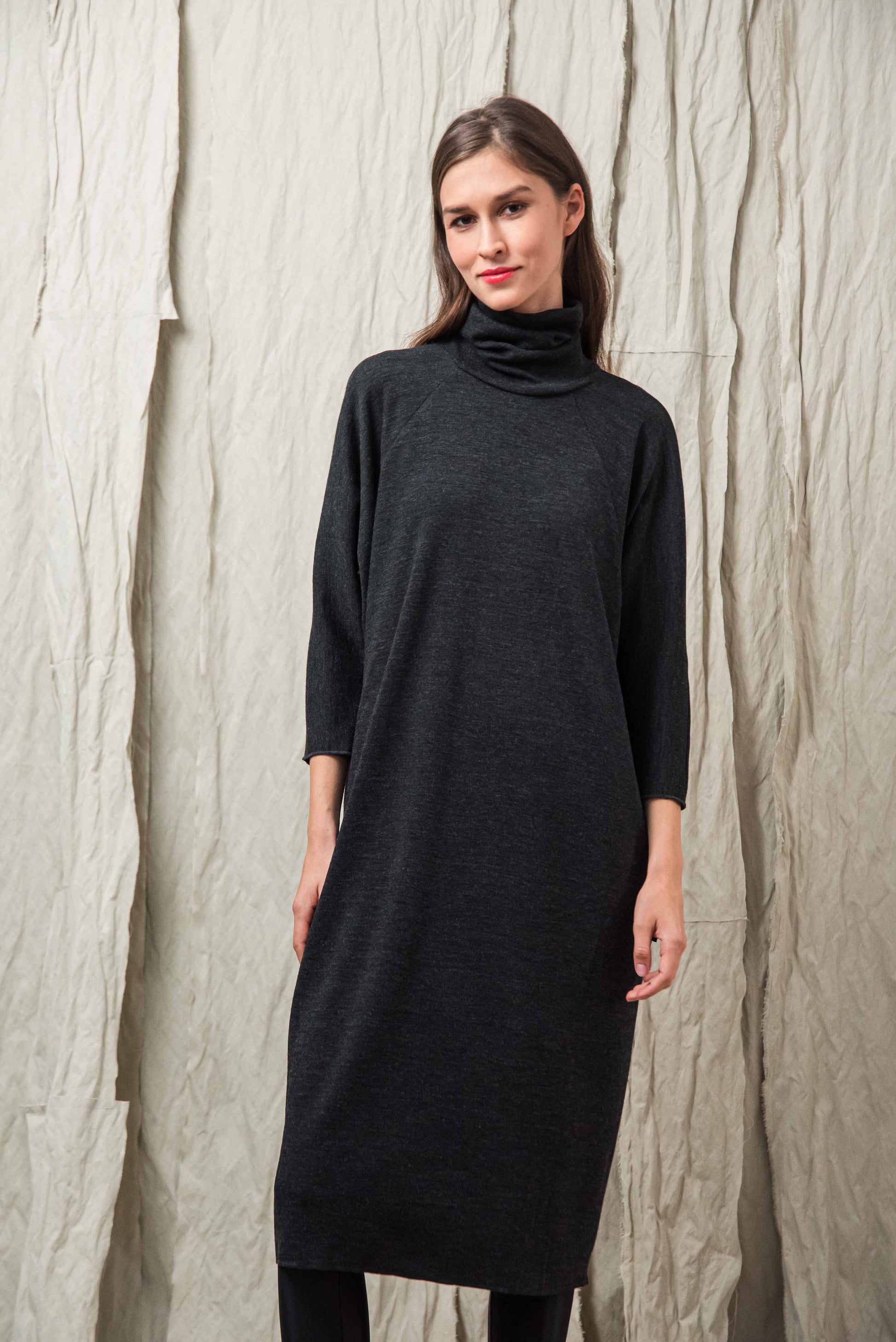 Ez a ruha 100% merinói gyapjú - cirmos antracit színű, magas minőségű, vékony jersey kötött alapanyagból készült. Természetes eredetéből adódóan a gyapjú közvetlenül a bőrön enyhén karakteres érzetet adhat, ezért érzékenyebb bőr esetén rétegezve ajánljuk. Kiváló hőszabályozó tulajdonságainak köszönhetően melegen tart, ugyanakkor jól szellőzik, így komfortos viseletet biztosít a hűvösebb időben. Tartós, időtálló anyag, amely megfelelő ápolás mellett hosszú ideig megőrzi minőségét és formáját.