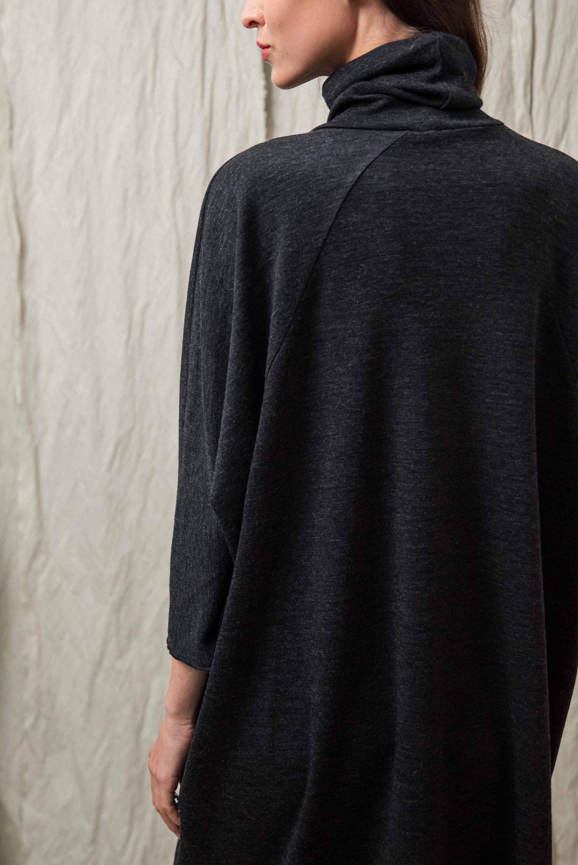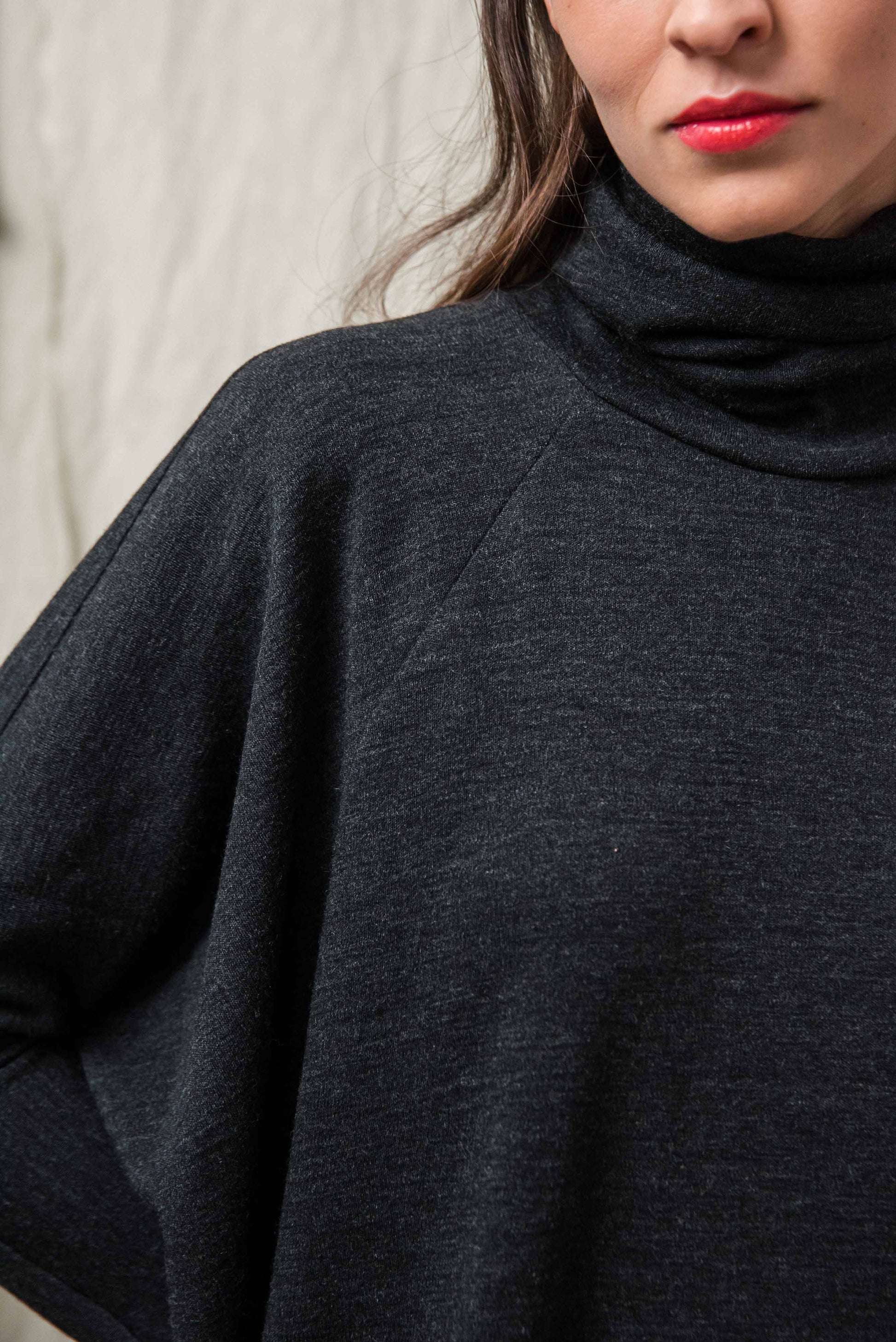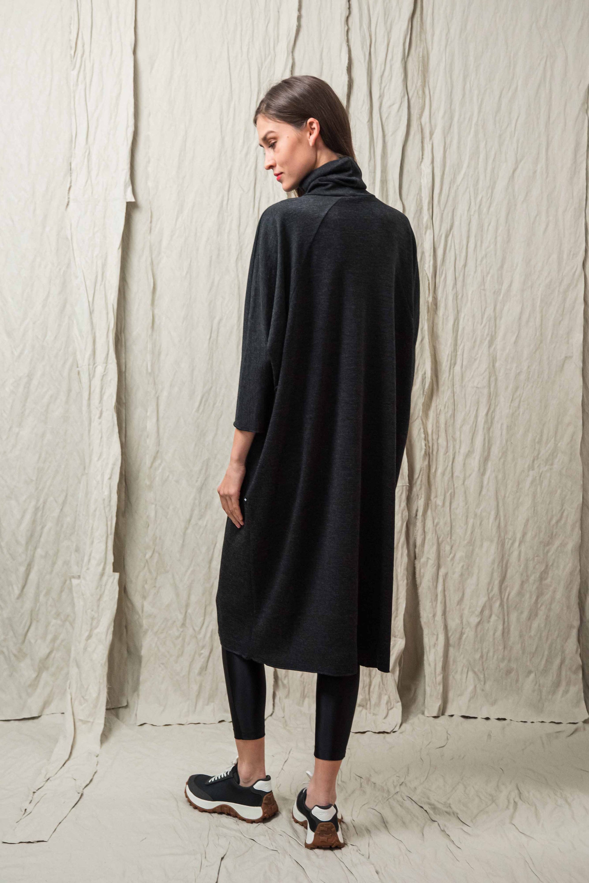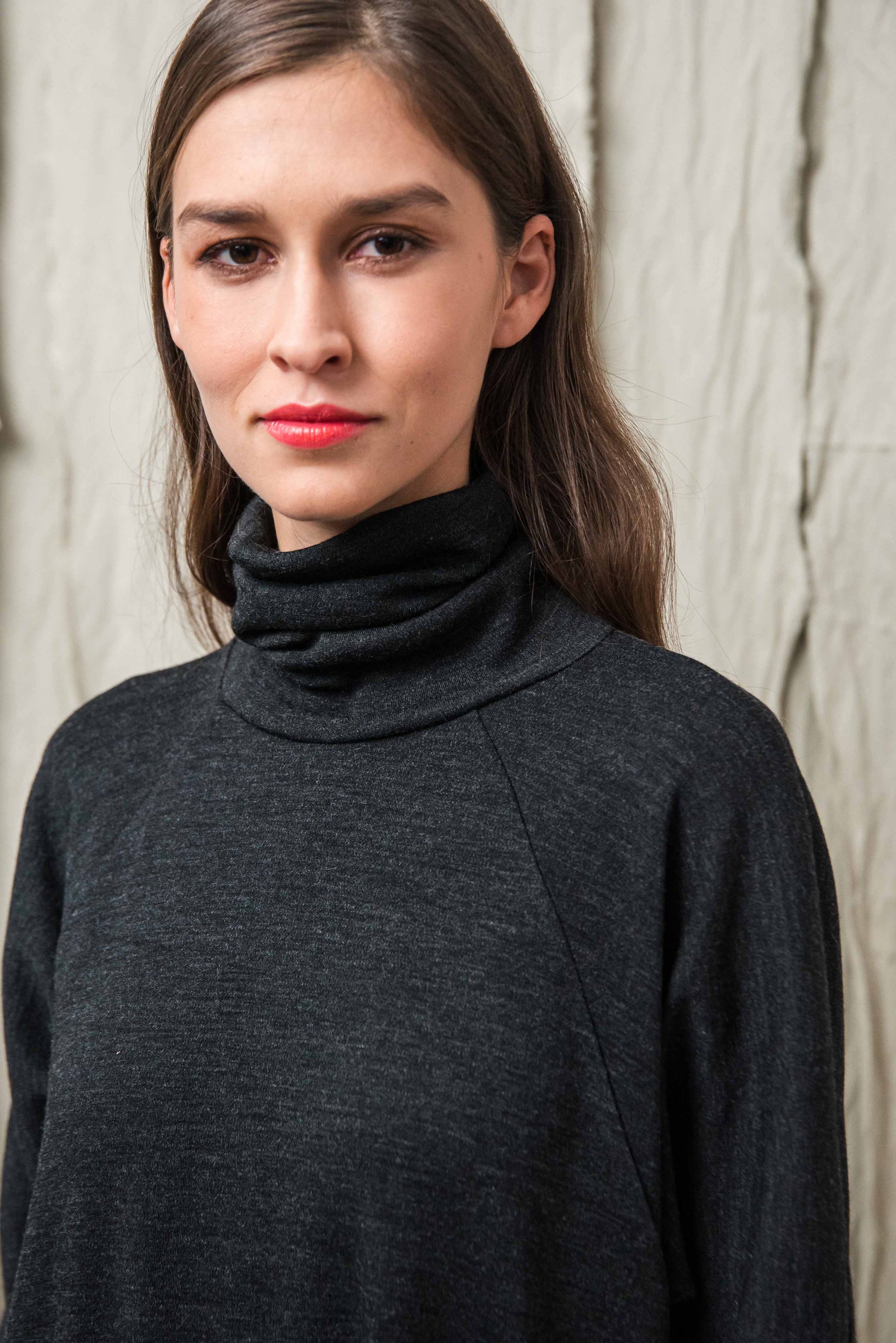 > A SONA raglán ruha azokra a mindennapokra készült, amikor a kényelem és az átgondolt megjelenés egyszerre fontos. Laza, bő szabása és raglán ujja szabad mozgást biztosít, miközben a garbós nyakrész határozott, karakteres megjelenést ad. A ¾-es ujjhossz és a térd alá érő fazon praktikussá teszi, könnyen rétegezhető, így több évszakban is jól használható. A mikrolockos eldolgozású anyagszélek nagyvonalúak, mégis finom részletként jelennek meg, visszafogott módon teszik egyedivé a ruhát. Fenntartható szemléletben, kis szériában készült, 100% merinói gyapjú, időtálló minőségű alapanyagból, hogy hosszú távon is megbízható része legyen a ruhatárnak. Egyetlen darabbal megoldja az öltözködést, miközben nyugodt, magabiztos megjelenést ad.