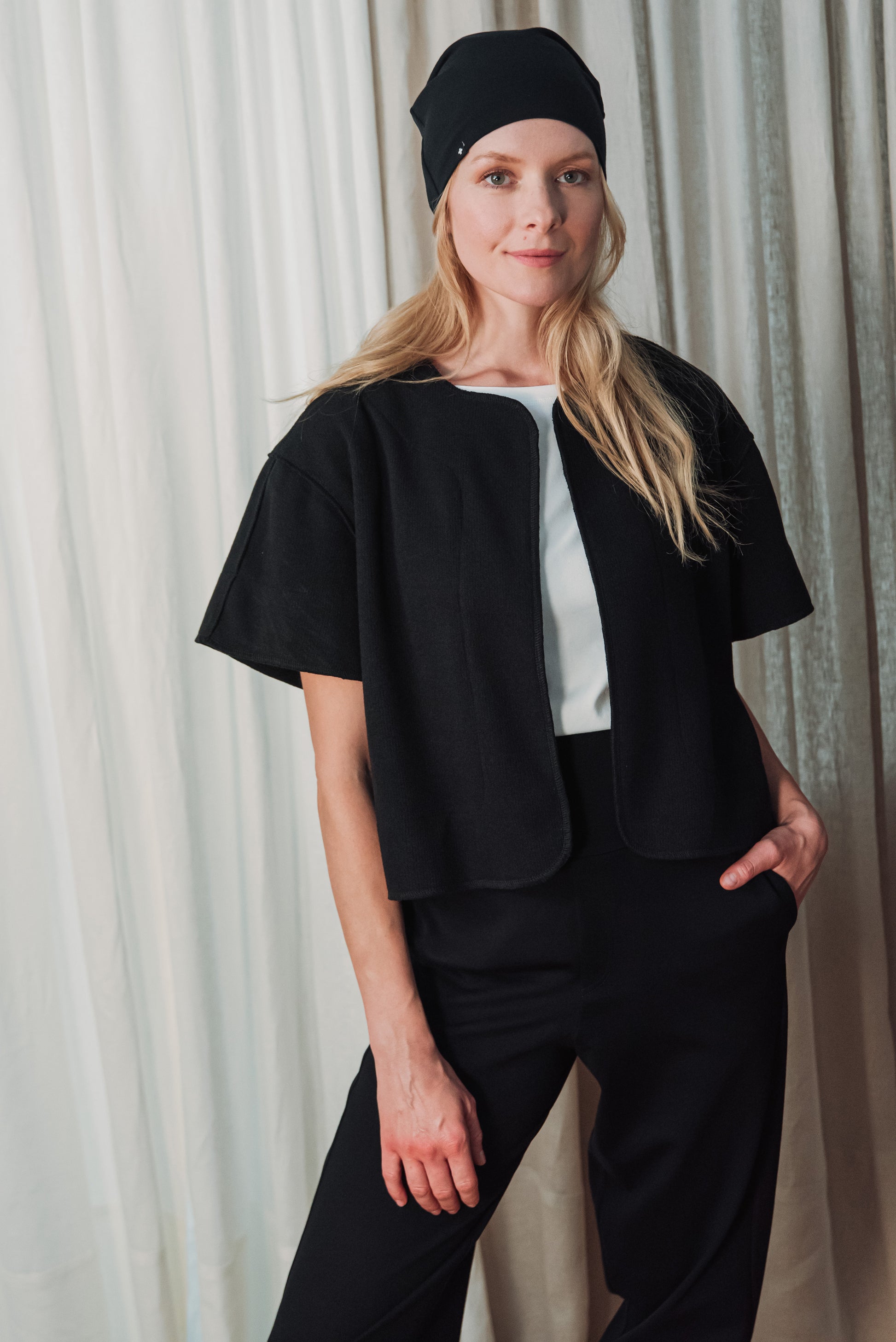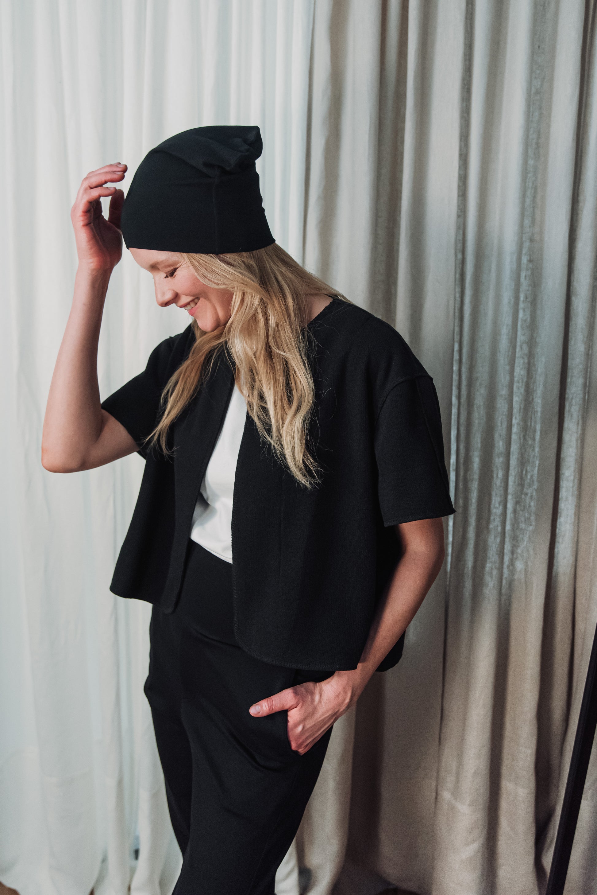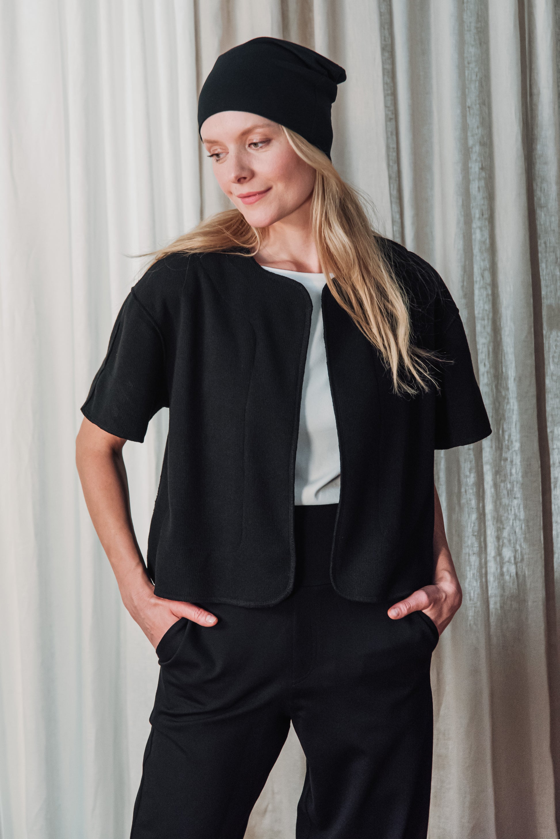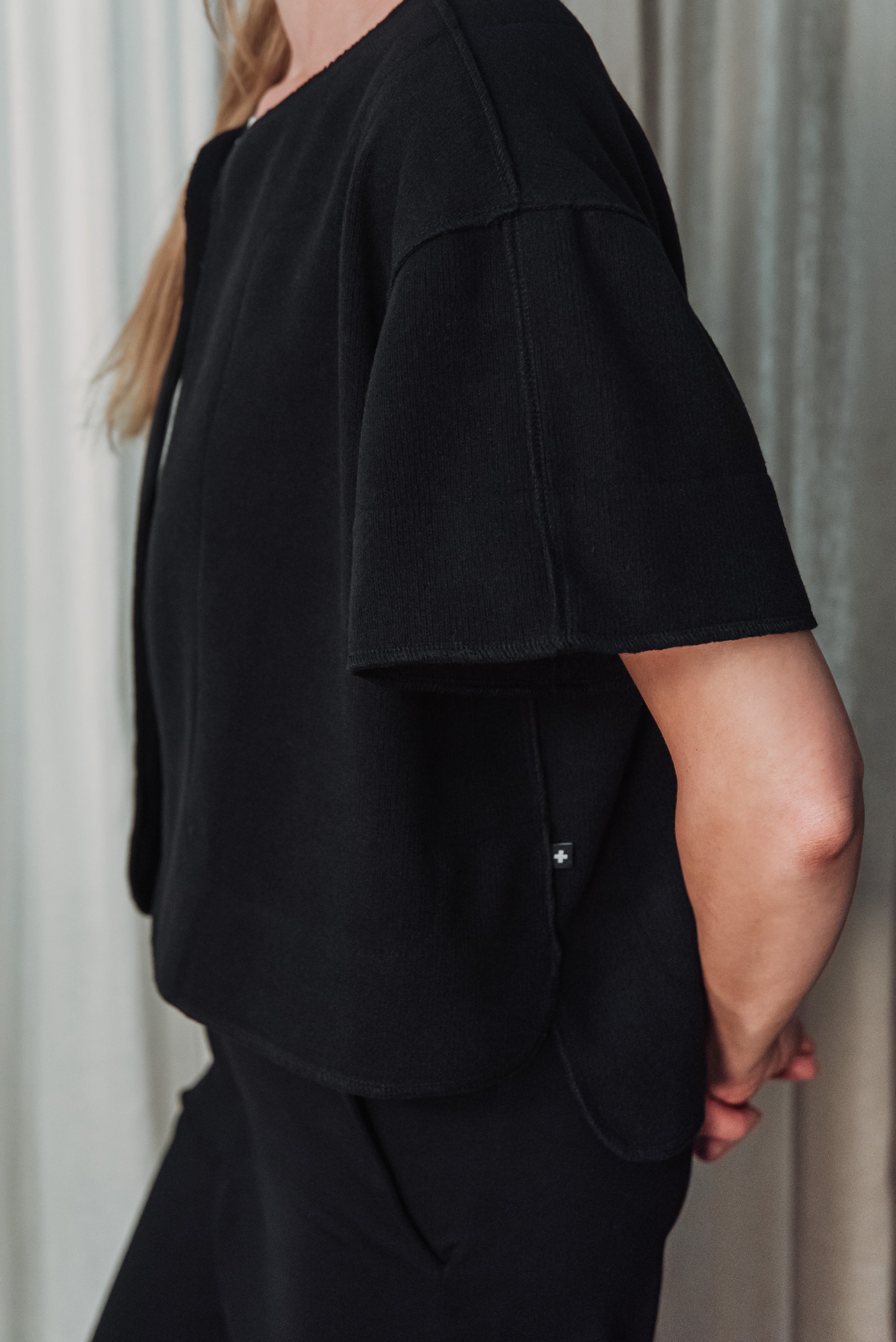 > A TEBA kardigán a rétegezésre tervezett, időtlen alapdarab – a letisztult formák és a kényelmes viselet találkozása. Puha, rugalmas fekete kötött anyagból készült, amely finoman tartja a formát, miközben puhaságával könnyed mozgást enged. Rövid ujja, íves eldolgozása és záródás nélküli kialakítása modern, levegős hatást kelt. A hidegebb időszakban belső rétegként, kardigánként viselhető, de önmagában is stílusos kiegészítője bármely összeállításnak. Letisztult vonalvezetése a NONPLUS-ra jellemző tudatos minimalizmust képviseli — egyszerre funkcionális és nőies, természetes és modern.