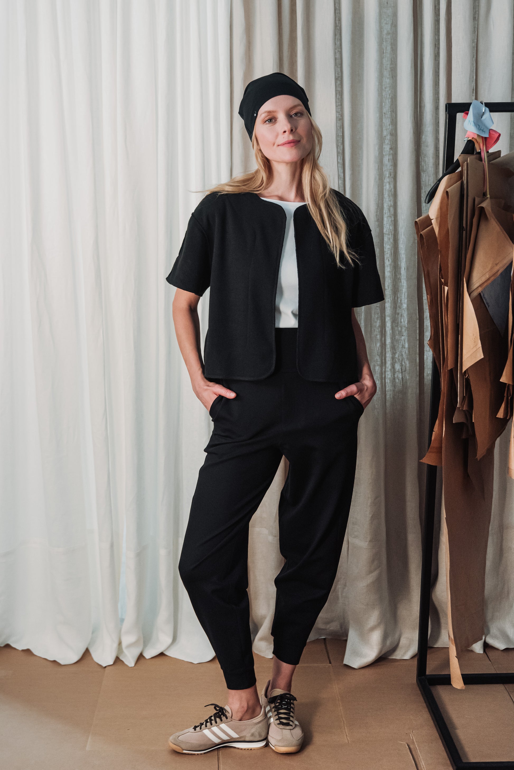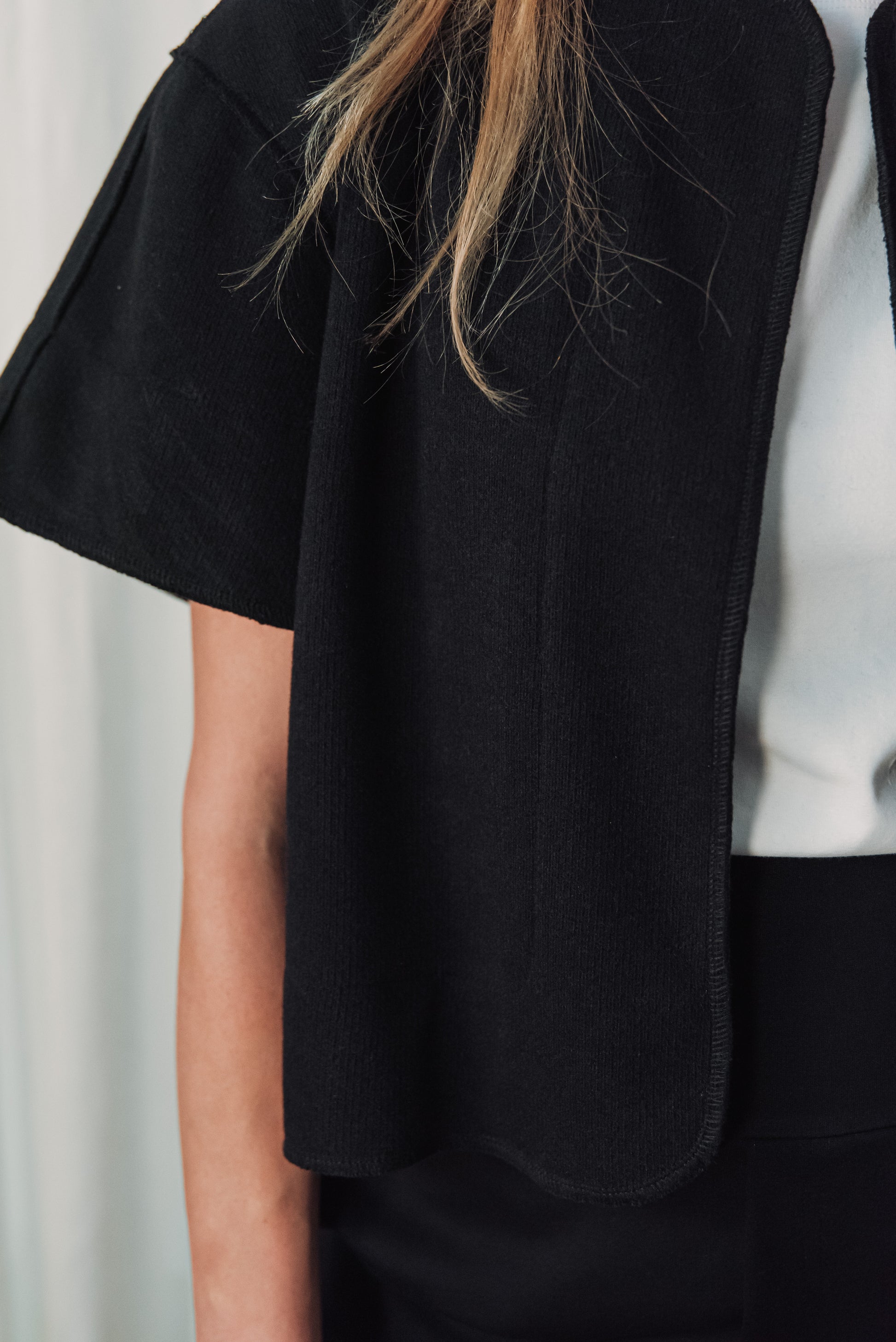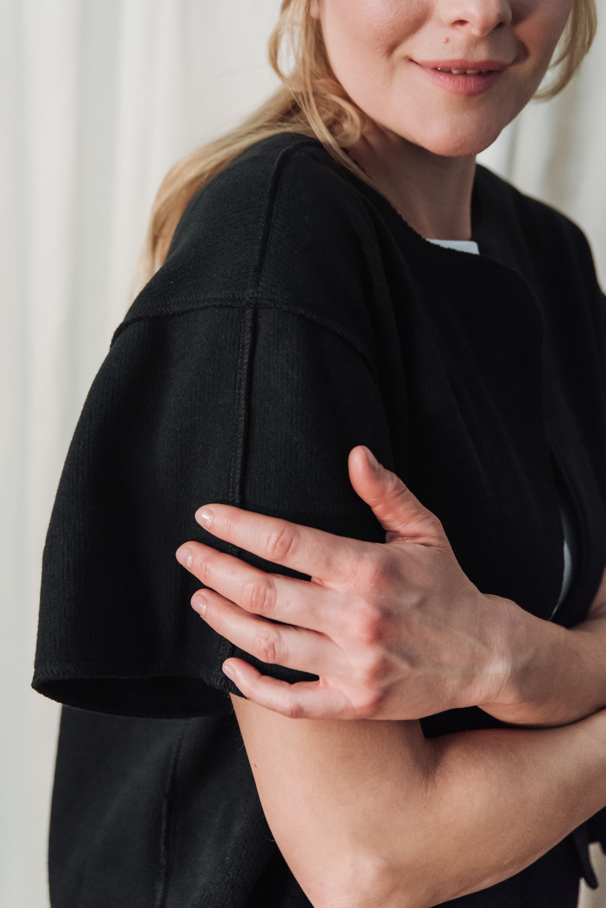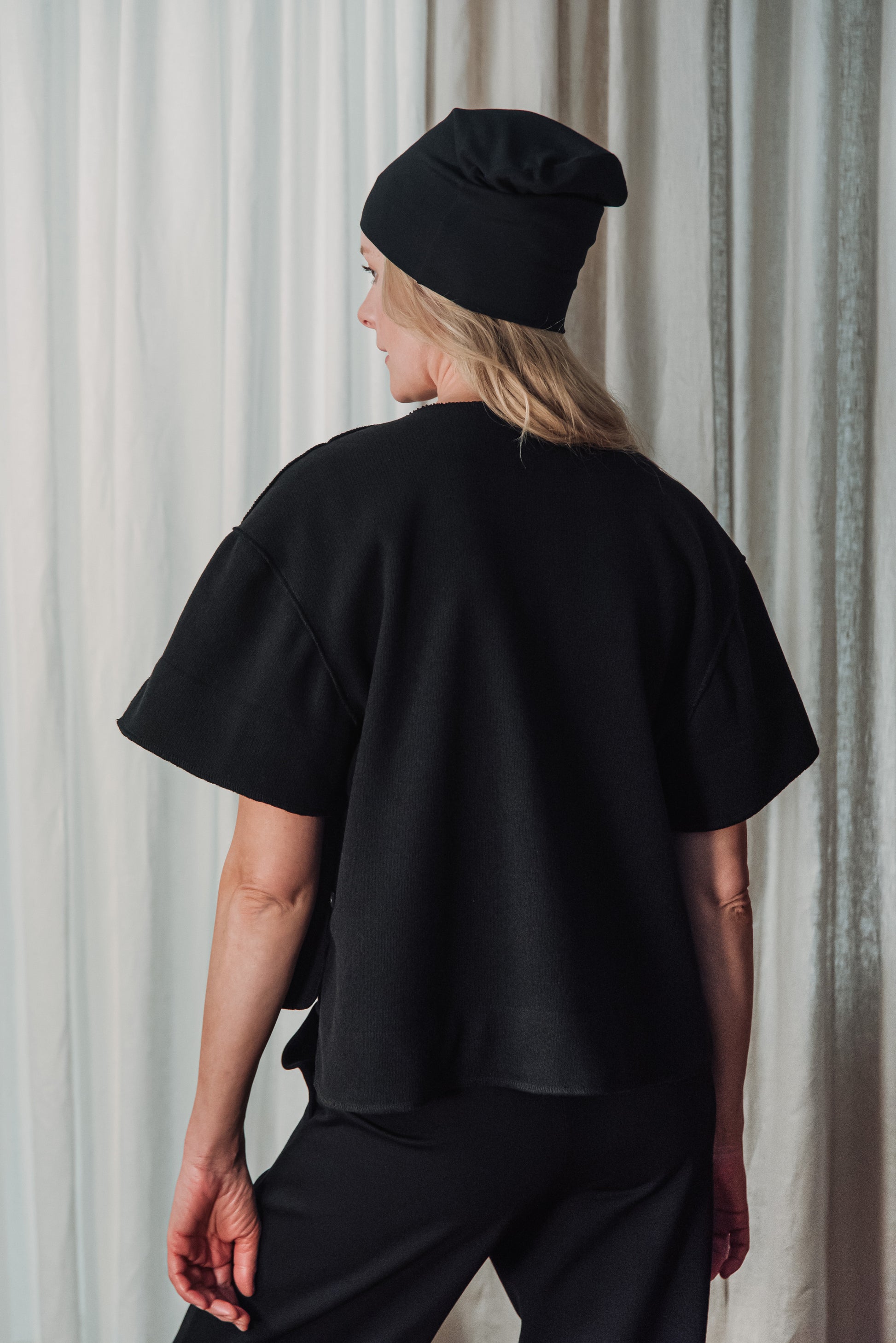> A TEBA kardigán a rétegezésre tervezett, időtlen alapdarab – a letisztult formák és a kényelmes viselet találkozása. Puha, rugalmas fekete kötött anyagból készült, amely finoman tartja a formát, miközben puhaságával könnyed mozgást enged. Rövid ujja, íves eldolgozása és záródás nélküli kialakítása modern, levegős hatást kelt. A hidegebb időszakban belső rétegként, kardigánként viselhető, de önmagában is stílusos kiegészítője bármely összeállításnak. Letisztult vonalvezetése a NONPLUS-ra jellemző tudatos minimalizmust képviseli — egyszerre funkcionális és nőies, természetes és modern.