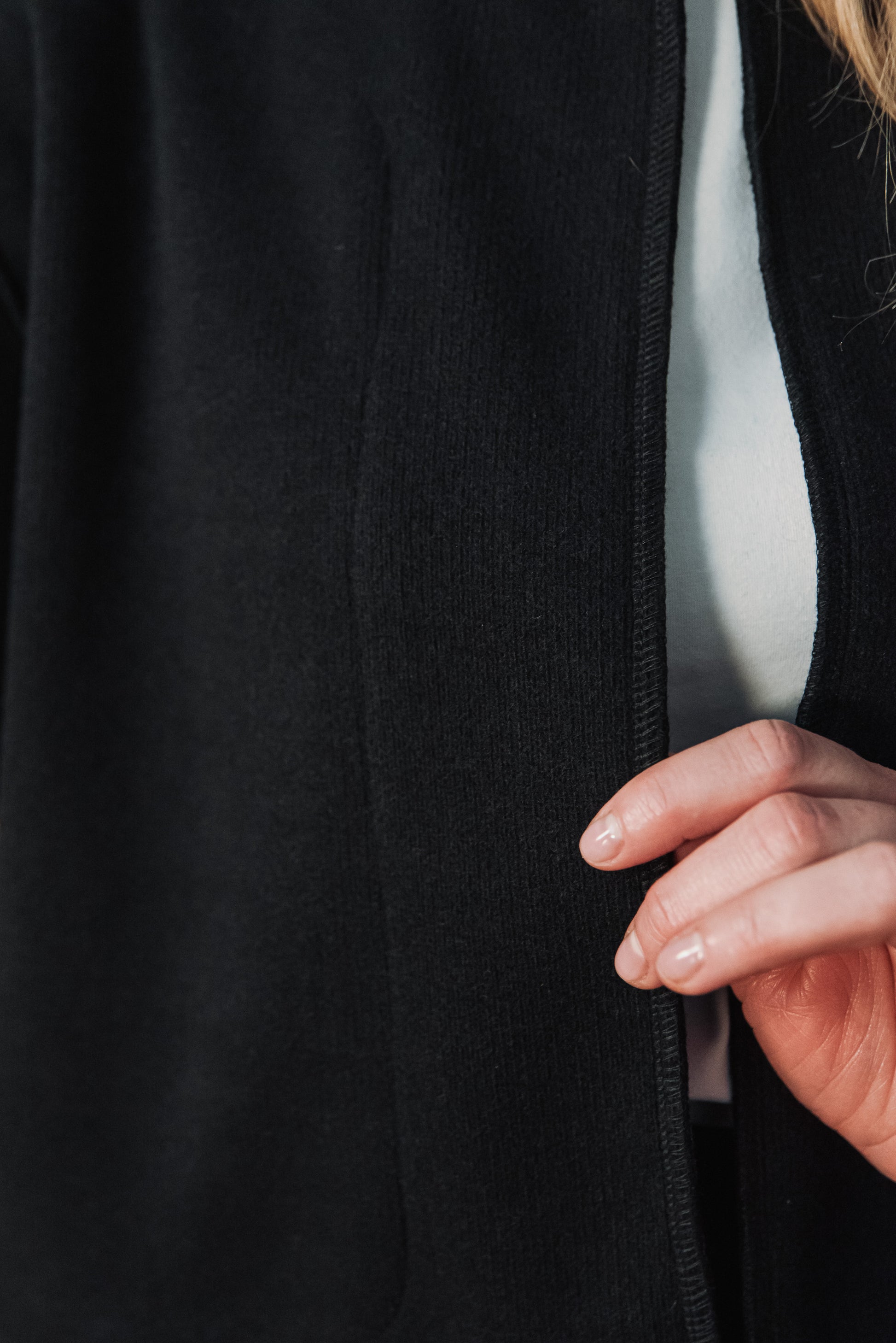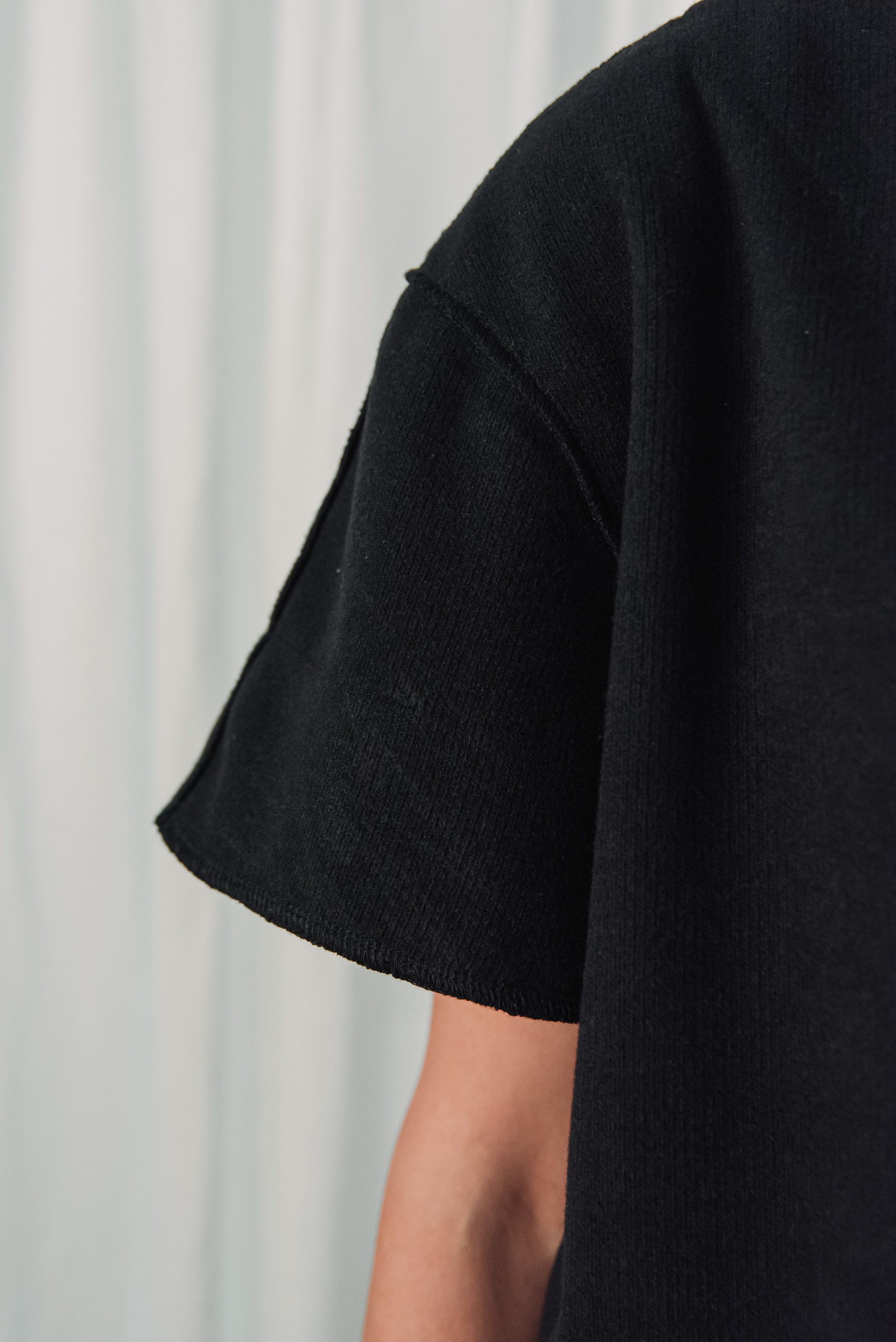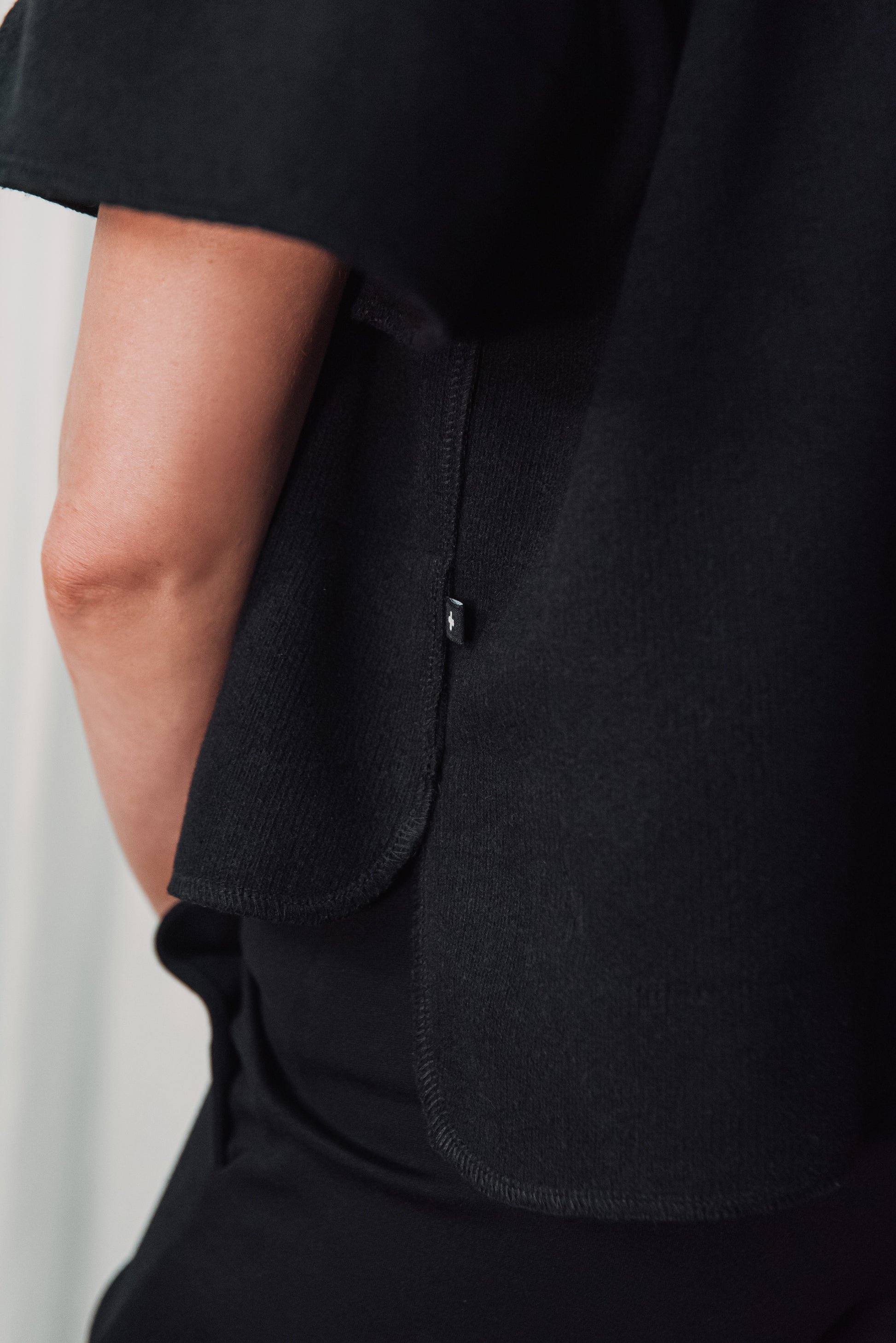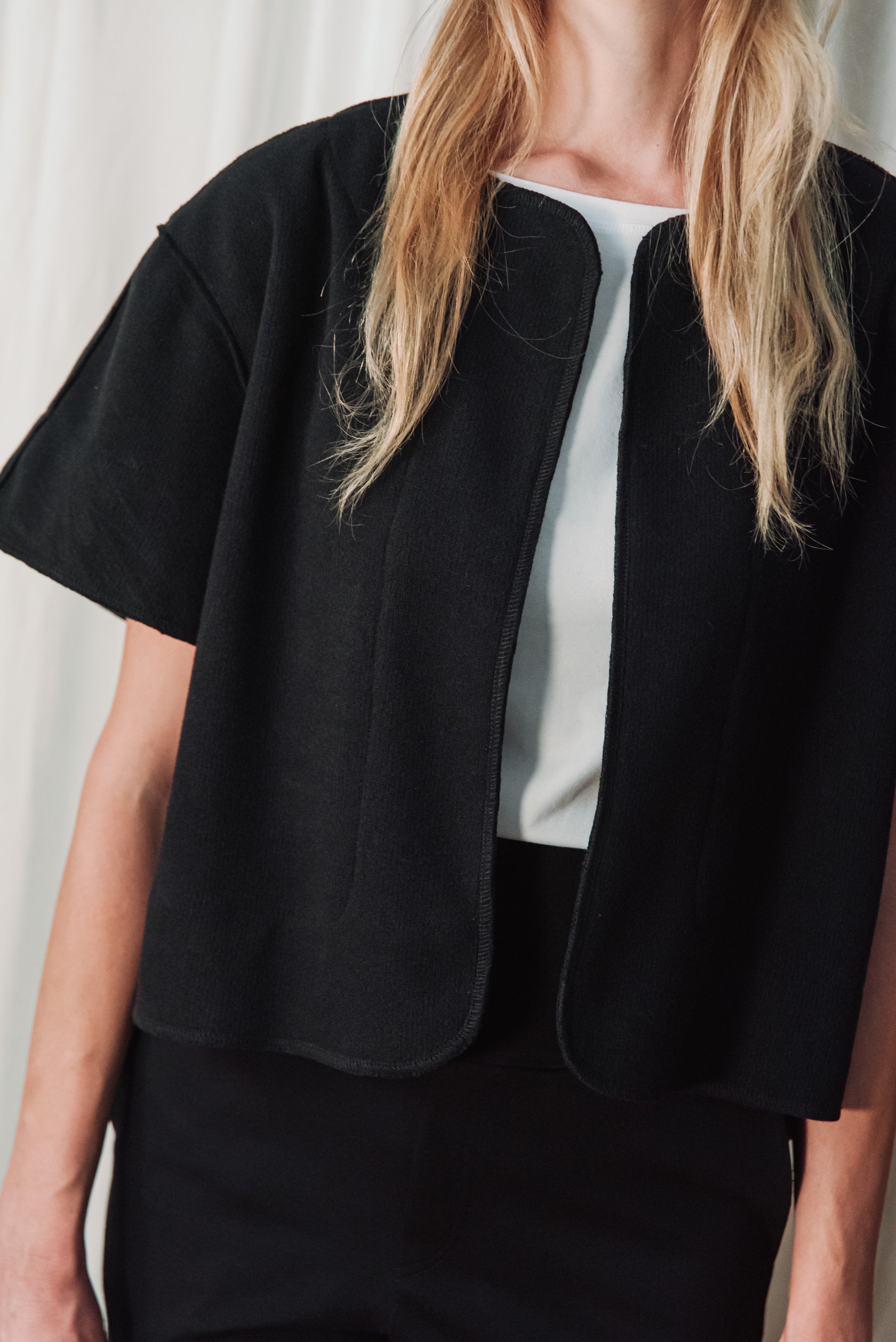 > A TEBA kardigán a rétegezésre tervezett, időtlen alapdarab – a letisztult formák és a kényelmes viselet találkozása. Puha, rugalmas fekete kötött anyagból készült, amely finoman tartja a formát, miközben puhaságával könnyed mozgást enged. Rövid ujja, íves eldolgozása és záródás nélküli kialakítása modern, levegős hatást kelt. A hidegebb időszakban belső rétegként, kardigánként viselhető, de önmagában is stílusos kiegészítője bármely összeállításnak. Letisztult vonalvezetése a NONPLUS-ra jellemző tudatos minimalizmust képviseli — egyszerre funkcionális és nőies, természetes és modern.